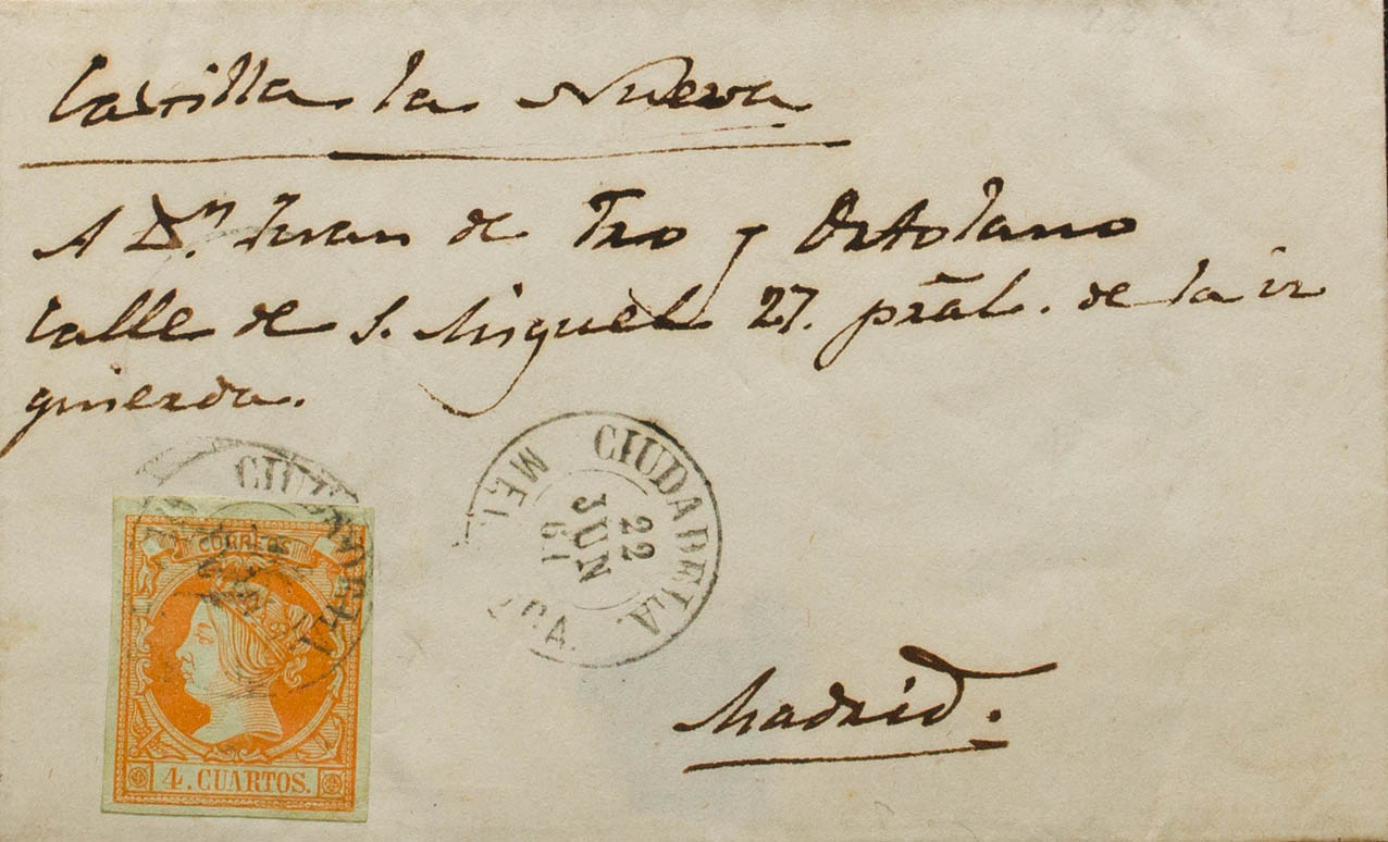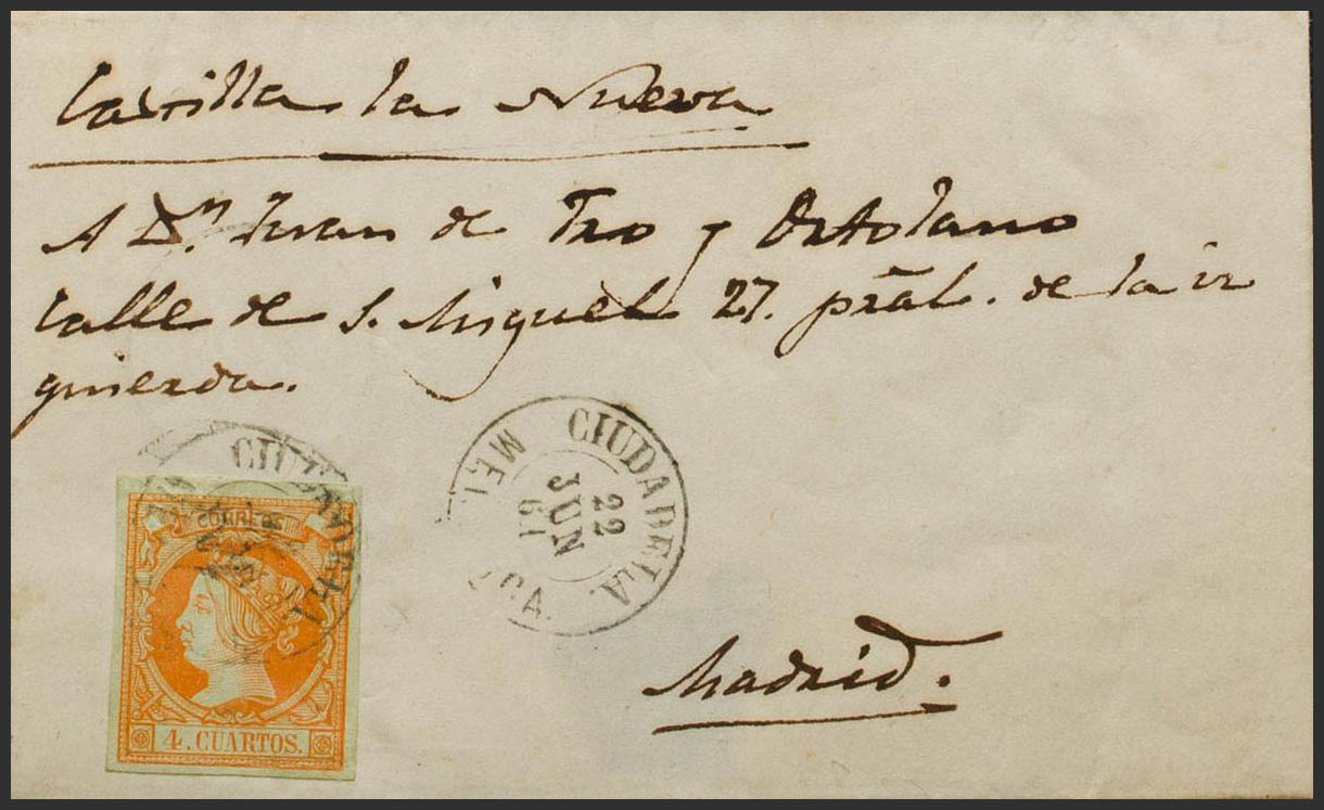52. 1861. 4 orange cuartos . CITADEL to MADRID. CITADEL / MENORCA postmark. MAGNIFICENT.