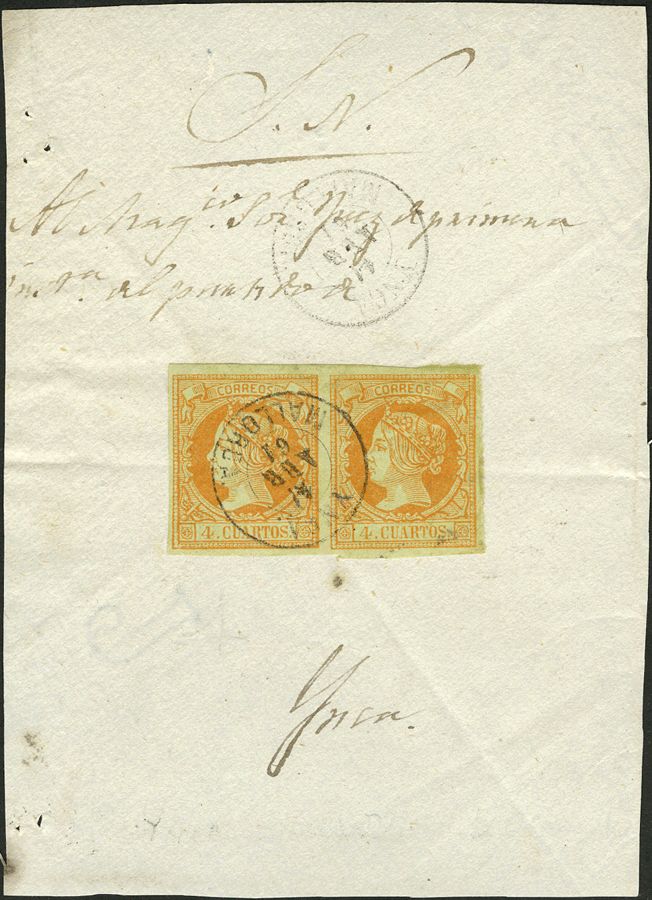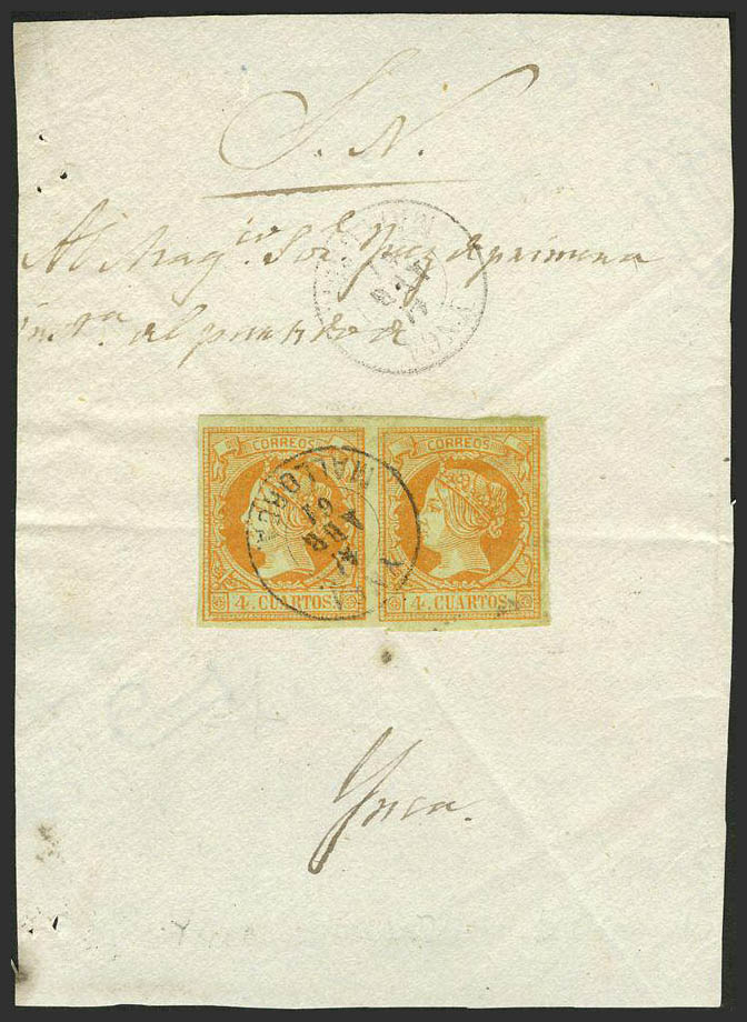 52(2). 1860. 4 cuartos yellow, pair. Front directed to INCA. Postmark YNCA / MALLORCA. MAGNIFICENT.