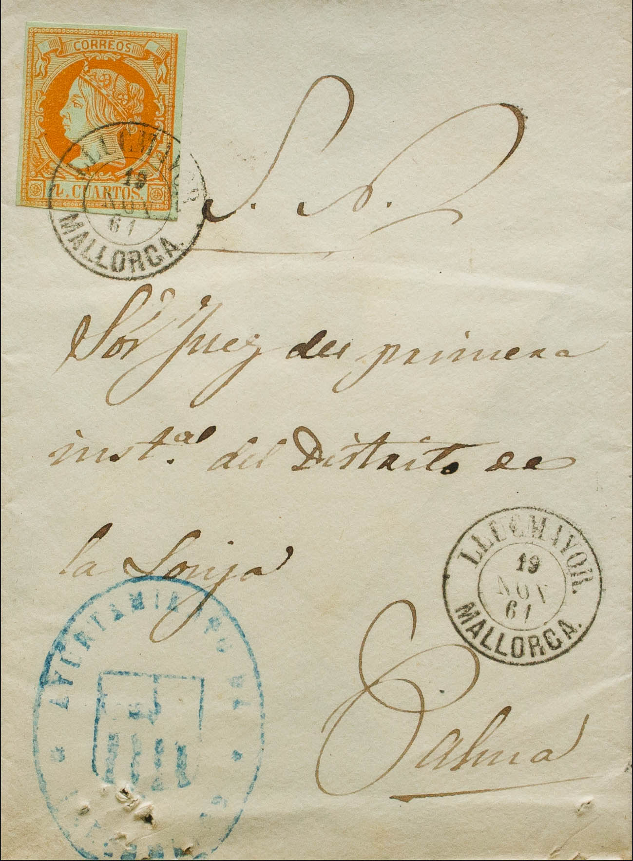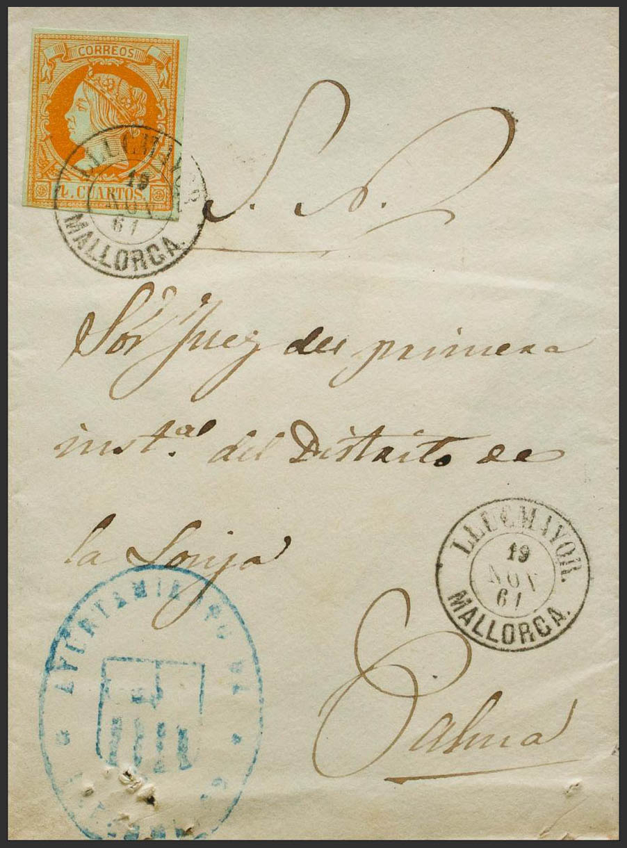 52. 1861. 4 orange cuartos . LLUCHMAYOR to PALMA. Postmark LLUCHMAYOR / MALLORCA. MAGNIFICENT AND RARE.