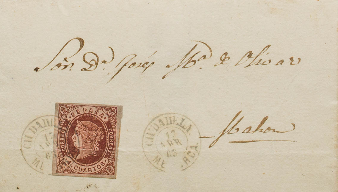English 58. 1863. 4- cuartos chestnut. CITADEL to MAHON. CITADEL / MENORCA postmark. MAGNIFICENT AND RARE.