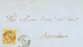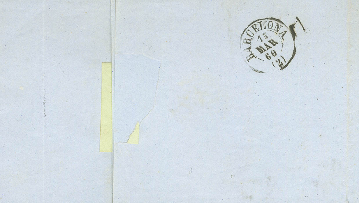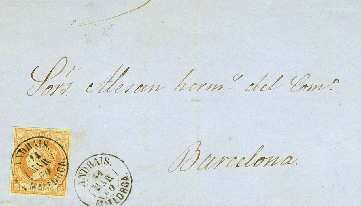 |ENVELOPE| 52. 1860. 4 orange quarters. ANDRAITX to BAGoodELONA. Postmark ANDRAIS / MALLOGoodA. MAGNIFICENT AND VERY RARE, SPECTACULAR PRINTING.