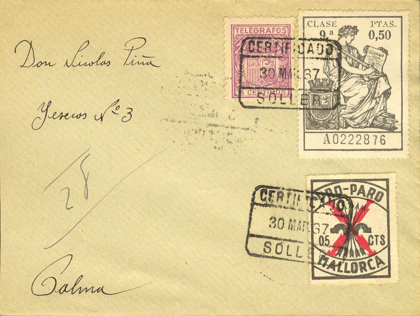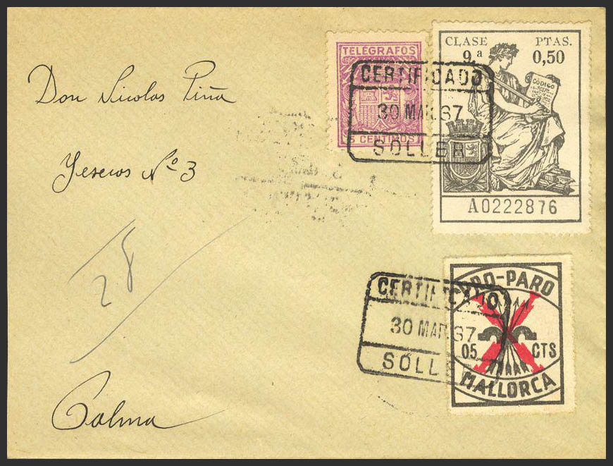 Fis 21. 1937. 50 cts black POLIZA. SOLLER to PALMA. On the back arrival. MAGNIFICENT AND RARE POSTAGE.