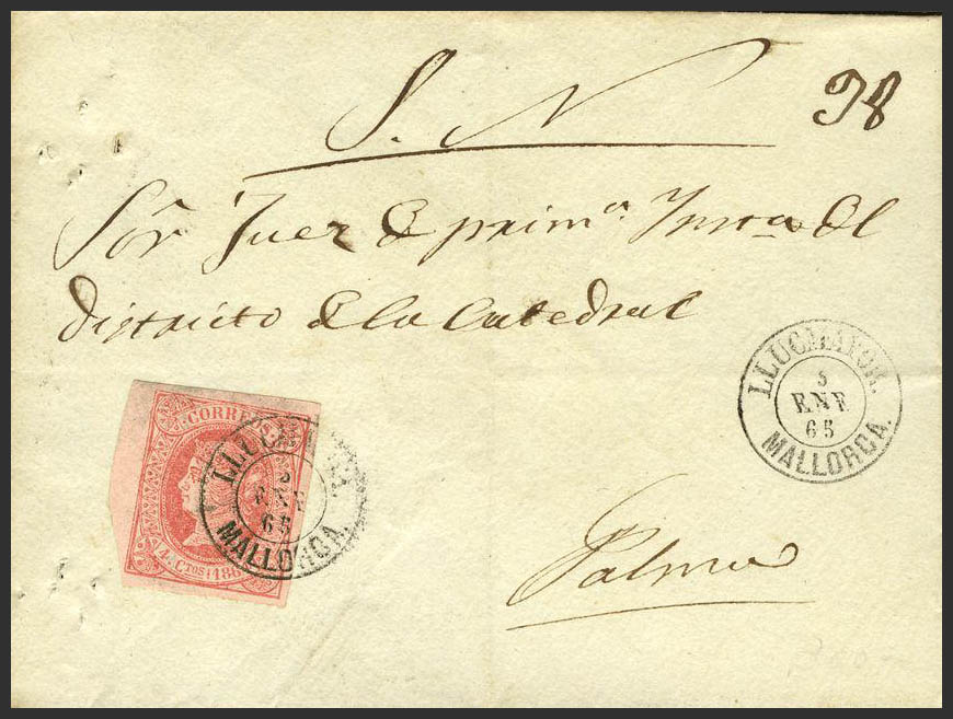 64. 1864. 4 cuartos pink. LLUCHMAYOR to PALMA. Postmark LLUCHMAYOR / MALLORCA. MAGNIFICENT AND RARE.
