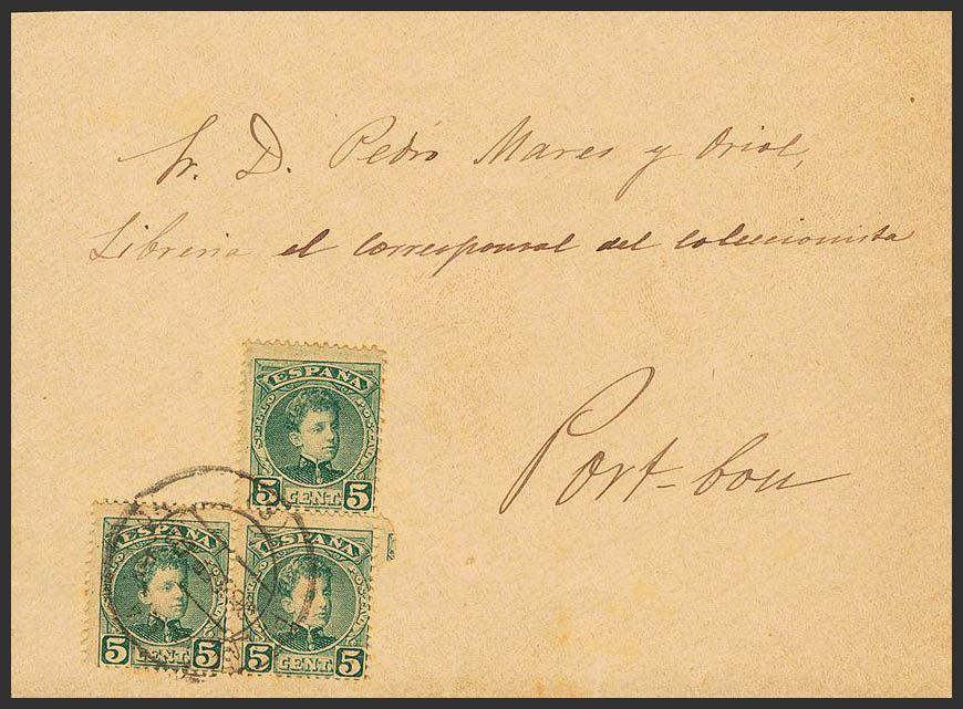 242(3). 1901. 5 green cts, three stamps. PALMA DE MALLORCA to PORT-BOU (GERONA). MAGNIFICENT AND UNUSUAL COMBINATION TO COMPOSE THE 15 CTS OF RATE.