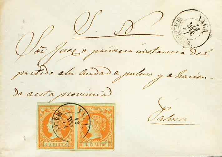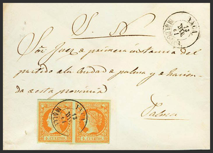 52(2). 1861. 4 cuartos orange, pair. INCA to PALMA DE MALLORCA. Postmark YNCA / MALLORCA. MAGNIFICENT AND VERY RARE.