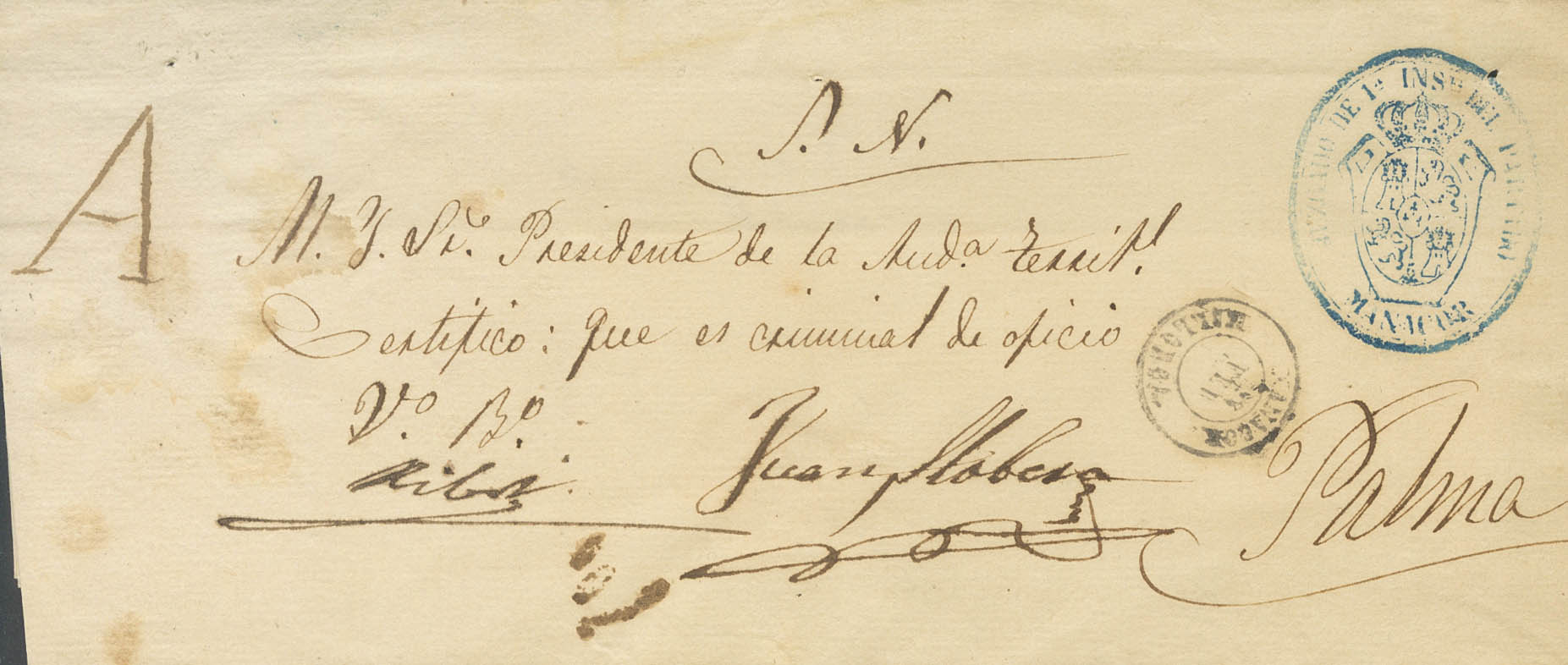 1872. Judicial Escrow from MANACOR to PALMA DE MALLORCA. Mark "A", handwritten subscription and date stamp MANACOR / MALLORCA. MAGNIFICENT AND RARE.