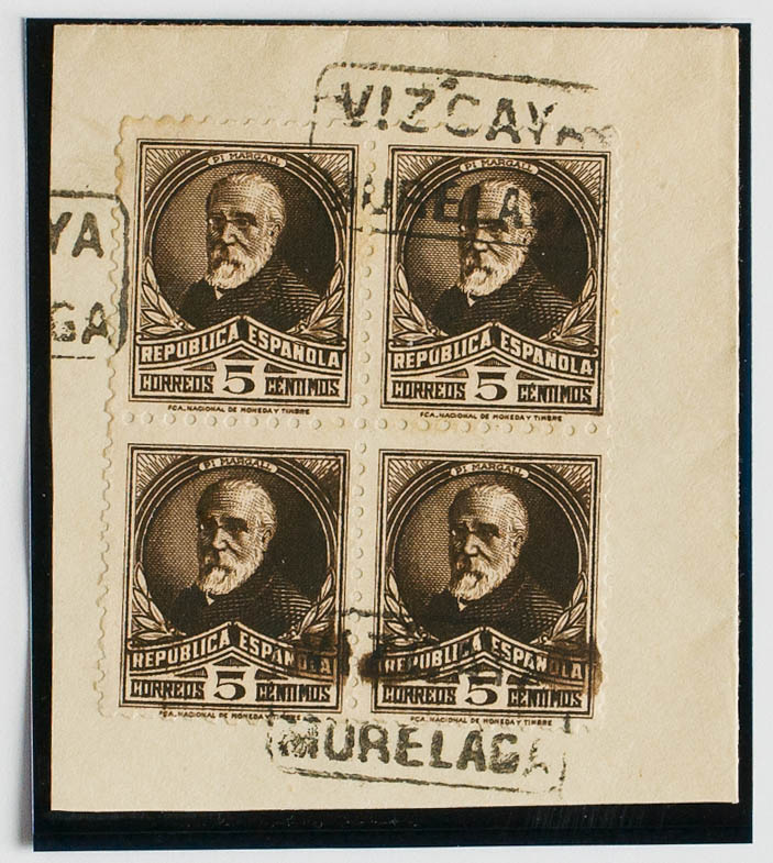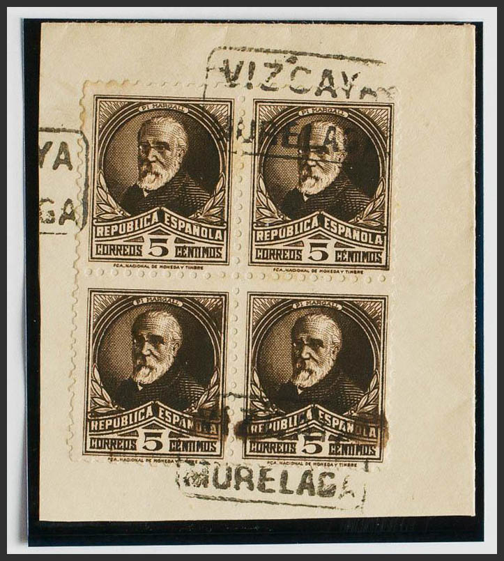 English △ 663(4). 1932. 5 black chestnut cts, block of four, on fragment. Mail postmark VIZCAYA / MURELAGA. MAGNIFICENT AND RARE.