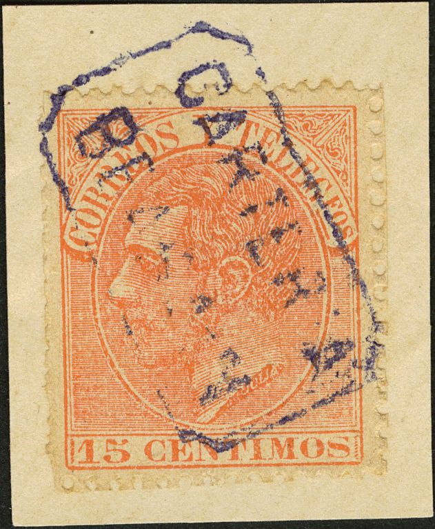 English △ 210. 1882. 15 cts orange, on fragment. Postmark CARTERIA / BEASAIN. MAGNIFICENT.