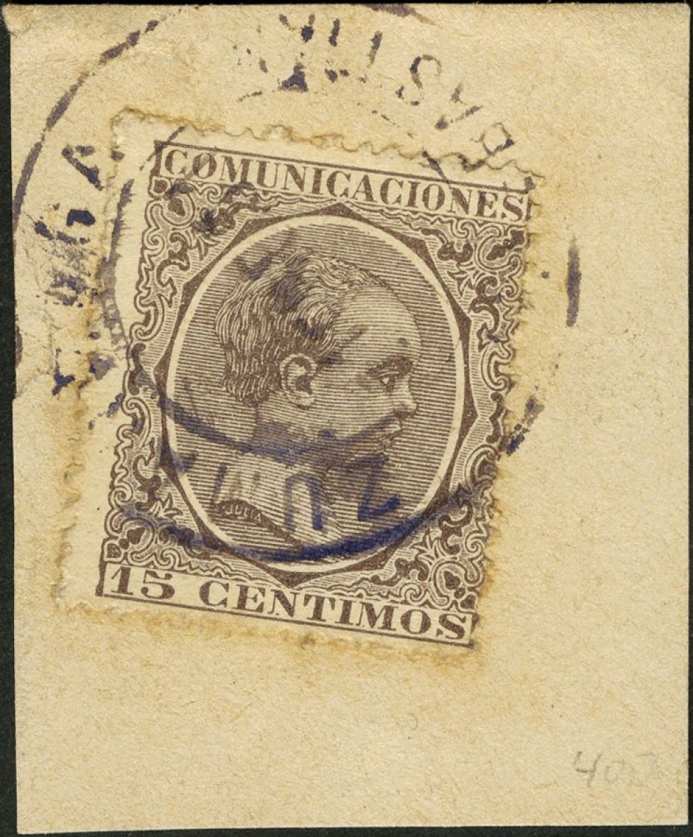 △ 219. 1889. 15 cts chestnut, on fragment. Postmark ZUMARRAGA / SAN SEBASTIAN.