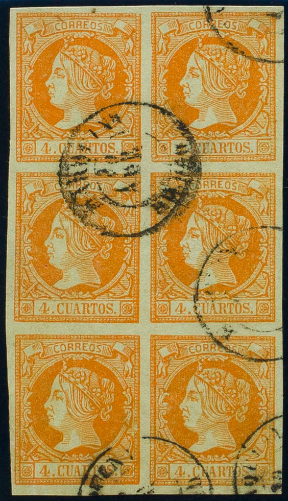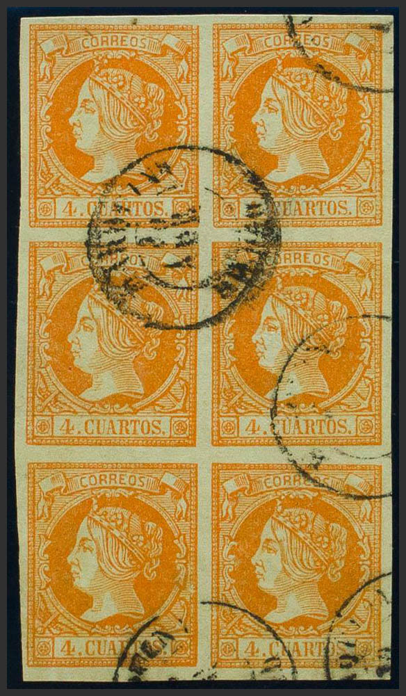 English 52(6). 1860. 4 orange cuartos , block of six. Postmark MARQUINA / BILBAO. MAGNIFICENT.