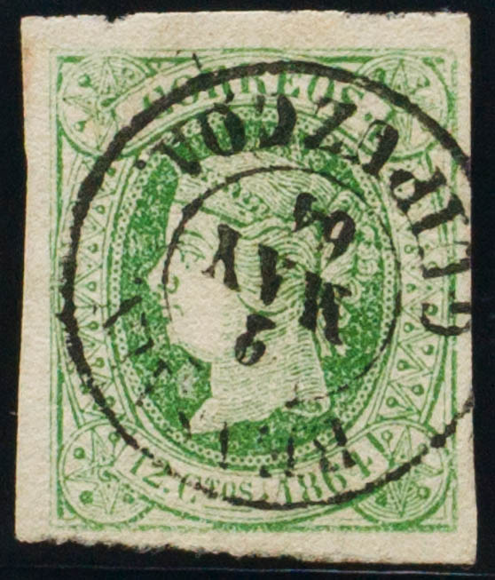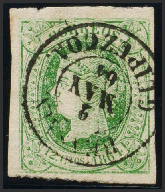 65. 1864. 12 cuartos green. Postmark BEASAIN / GUIPUZCOA. MAGNIFICENT.