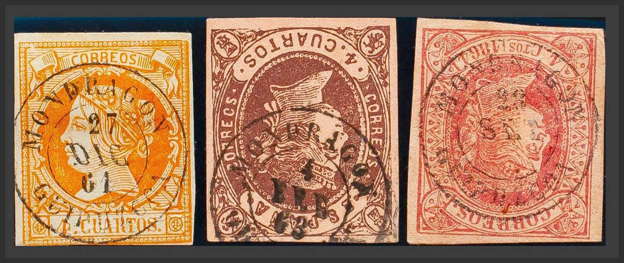 52, 58, 64. (1860ca). Set of three 4- cuartos yellow, brown and pink stamps, unused with MONDRAGON / GUIPUZCOA postmark. MAGNIFICENT.