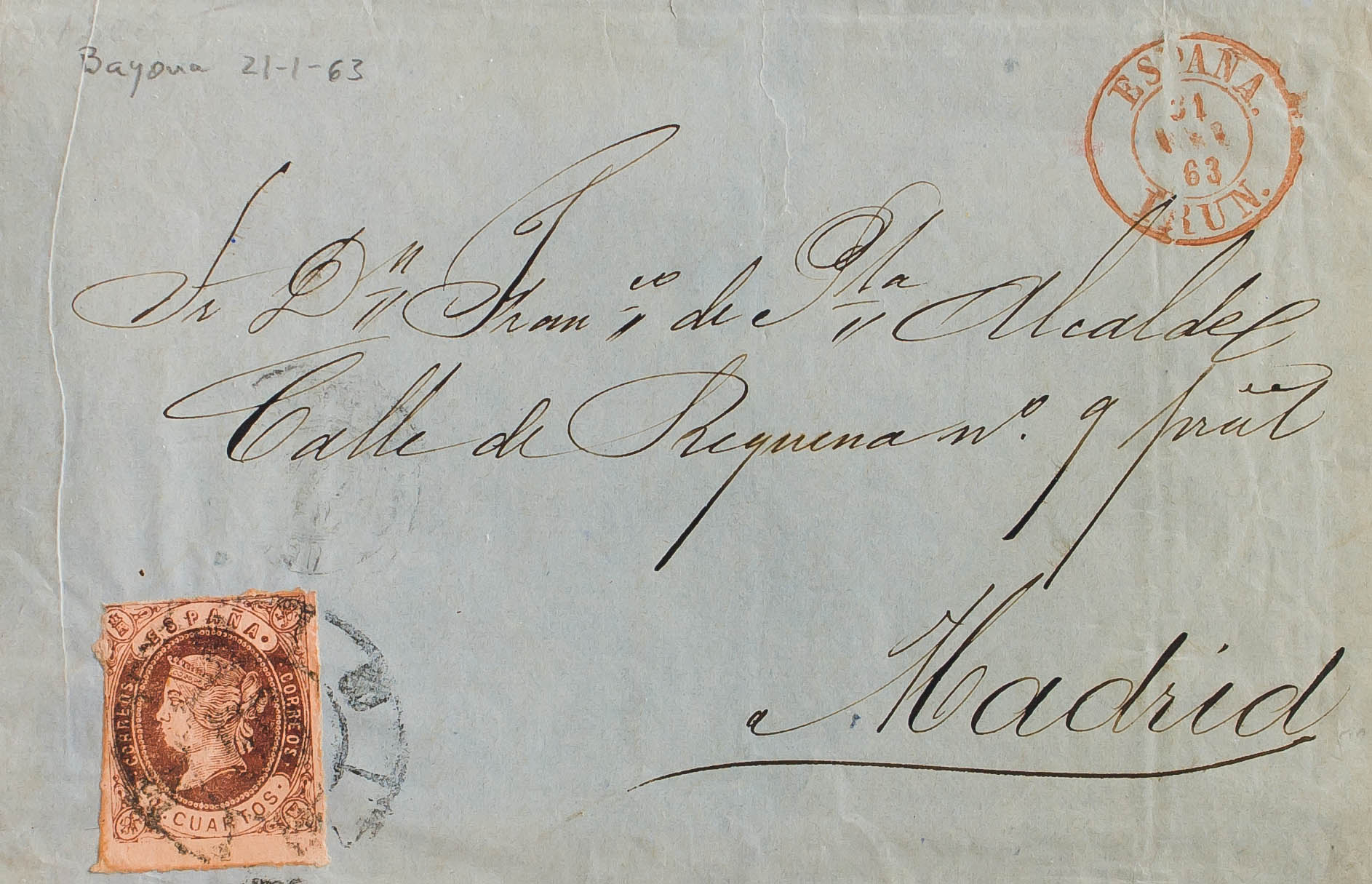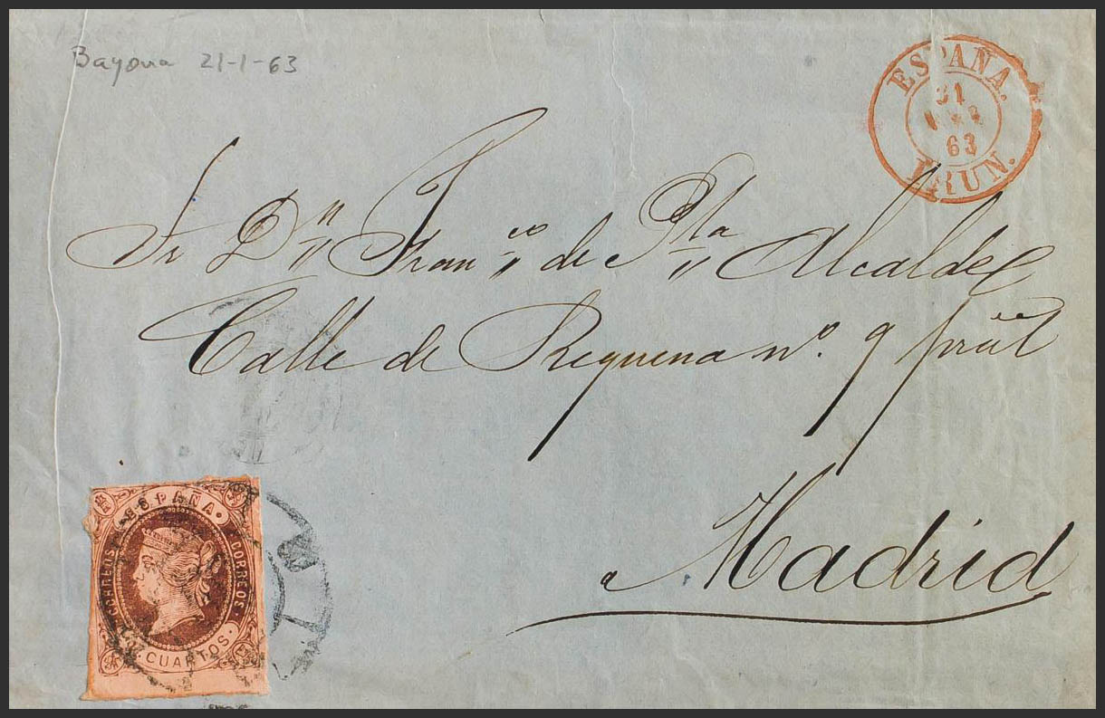 58. 1863. 4- cuartos chestnut. IRUN to MADRID. Postmark R.CARRETA Nº50. MAGNIFICENT.