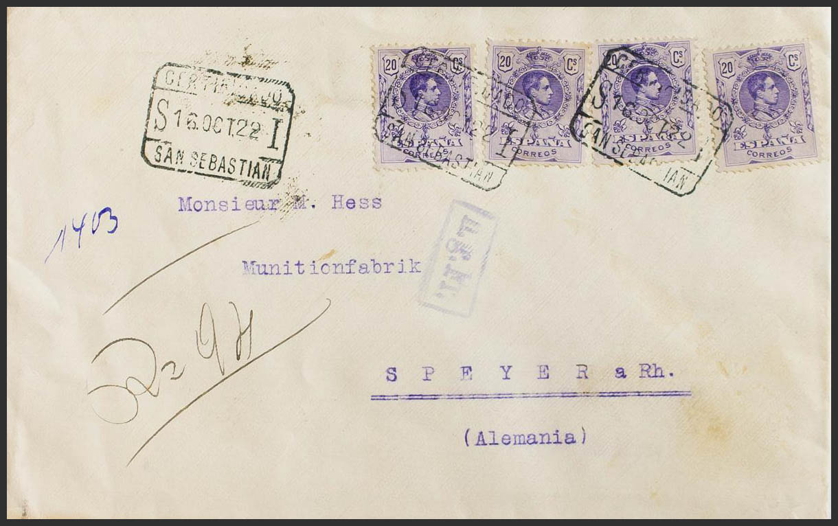273(4). 1922. 20 violet cts, four stamps. Certificate from SAN SEBASTIAN to SPEYER (GERMANY). On the back arrival. MAGNIFICENT AND SPECTACULAR.