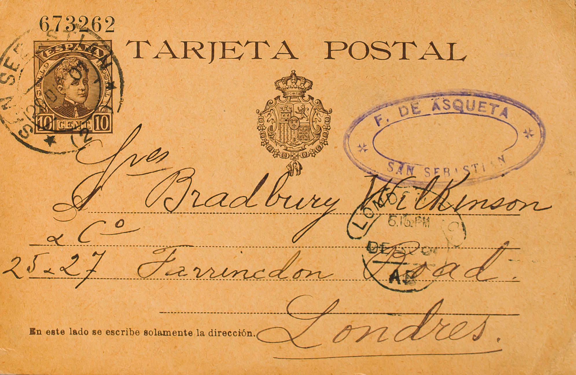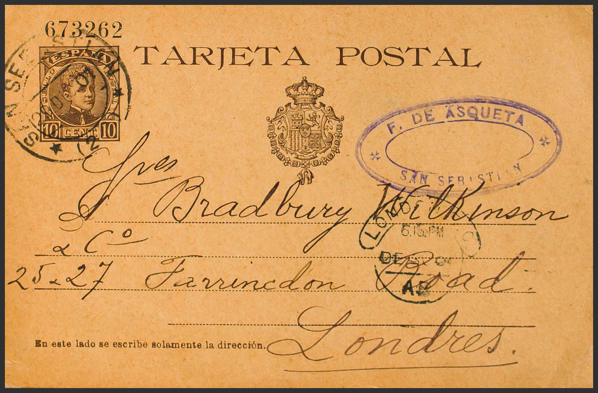 EP37. 1901. 10 cts chestnut envelope Post Card from SAN SEBASTIAN to LONDON (ENGLAND). On the arrival front. MAGNIFICENT.