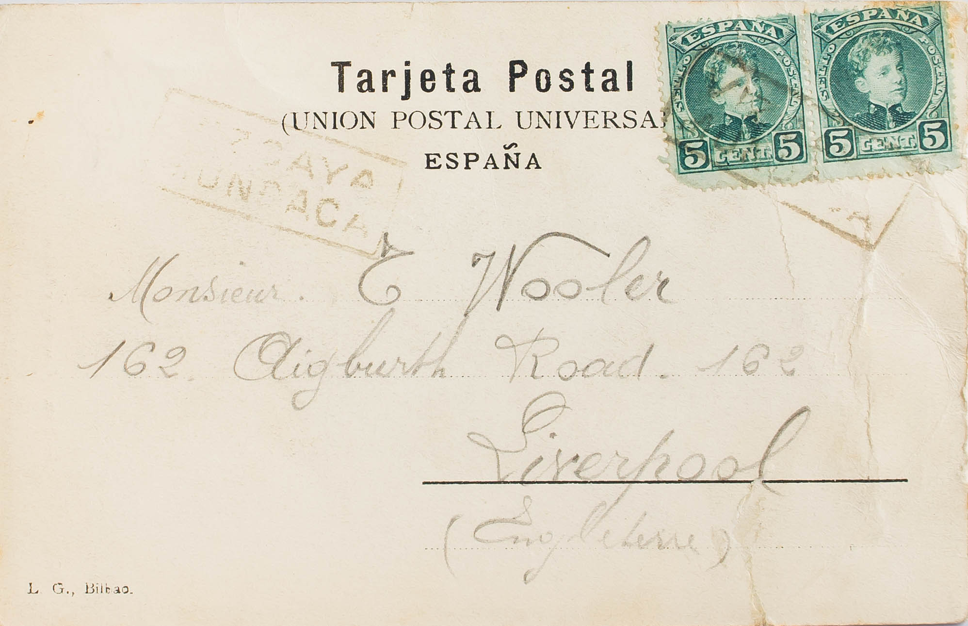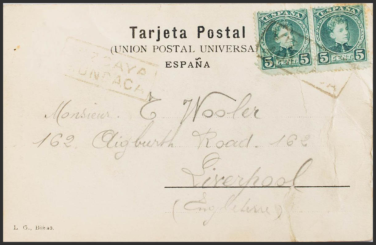 242(2). (1900ca). 5 cts, two stamps (one small defect stamp). Postcard from MUNDACA (BIZCAYA) to LIVERPOOL (ENGLAND). Mail postmark VIZCAYA / MUNDACA. MAGNIFICENT AND RARE.