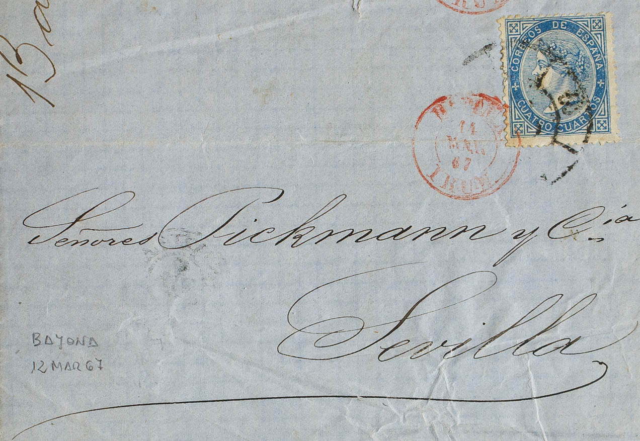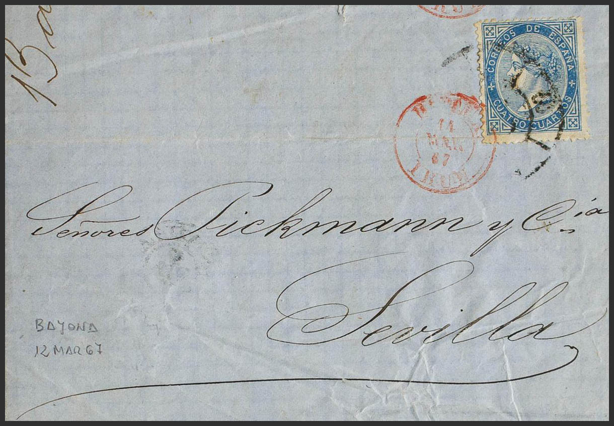 88. 1867. 4 cuartos blue. BAYONNE (FRANCE) to SEVILLE. Deposited in the Irun post office, where a Spanish stamp is added and it is sent to its destination. MAGNIFICENT AND RARE.