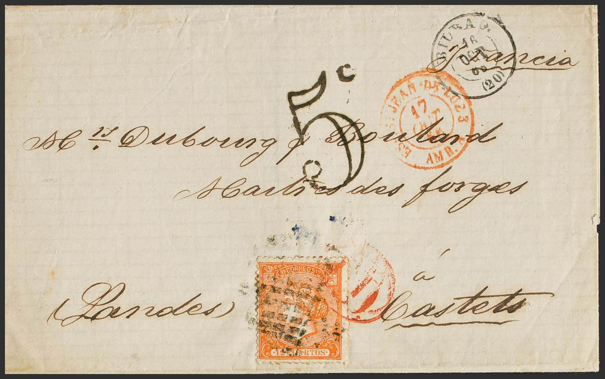 82. 1866. 12 orange cuartos . BILBAO to CASTETS (FRANCE). Postmark CIRCLE OF SEGMENTED LINES, from Bilbao. MAGNIFICENT.