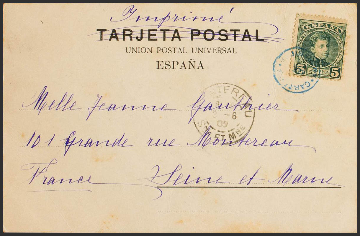 242. 1906. 5 cts green. Postcard from AMOREBIETA to SEINE ET MARNE (FRANCE). Postmark CARTERIA / DE / AMOREBIETA. MAGNIFICENT AND RARE.