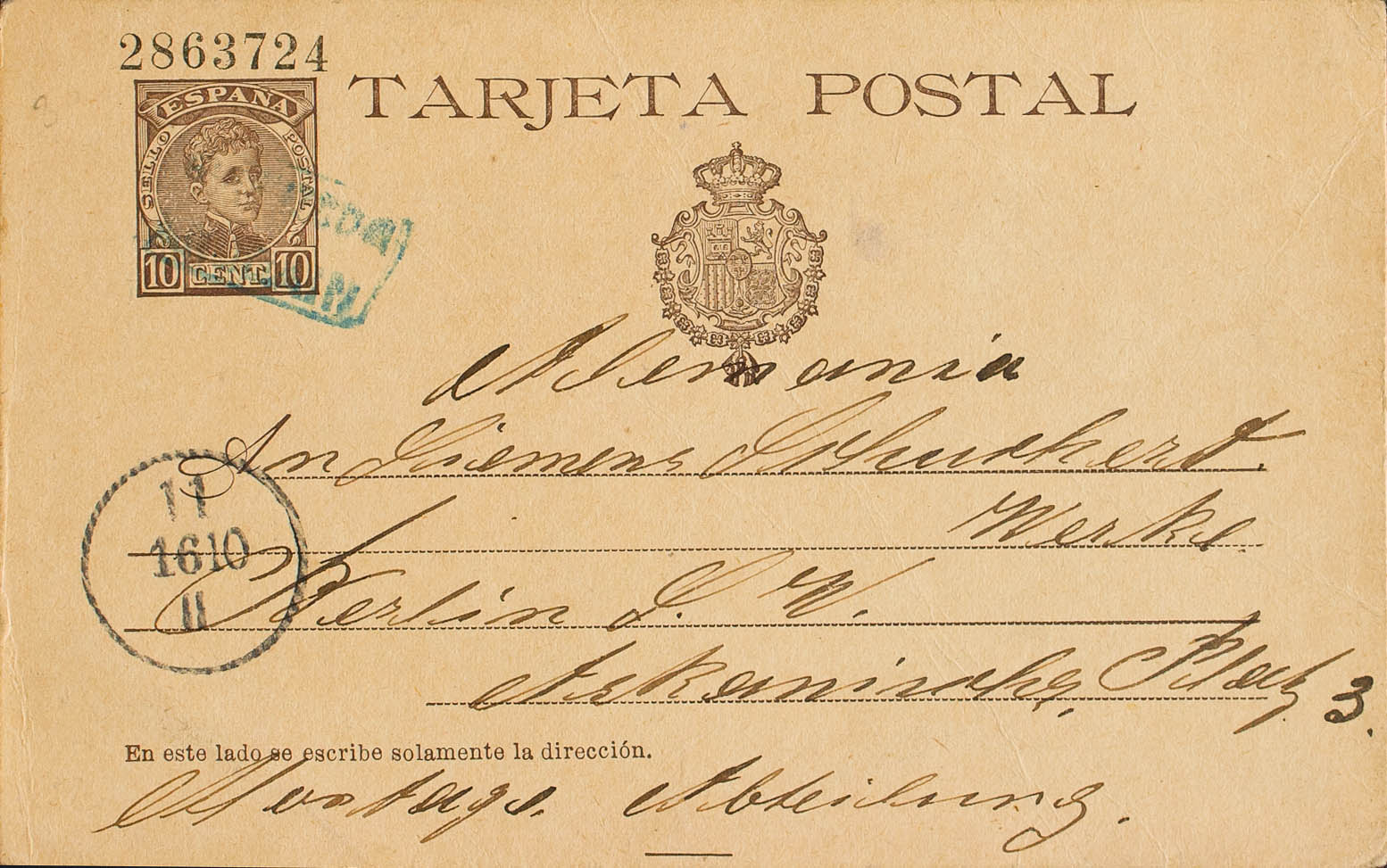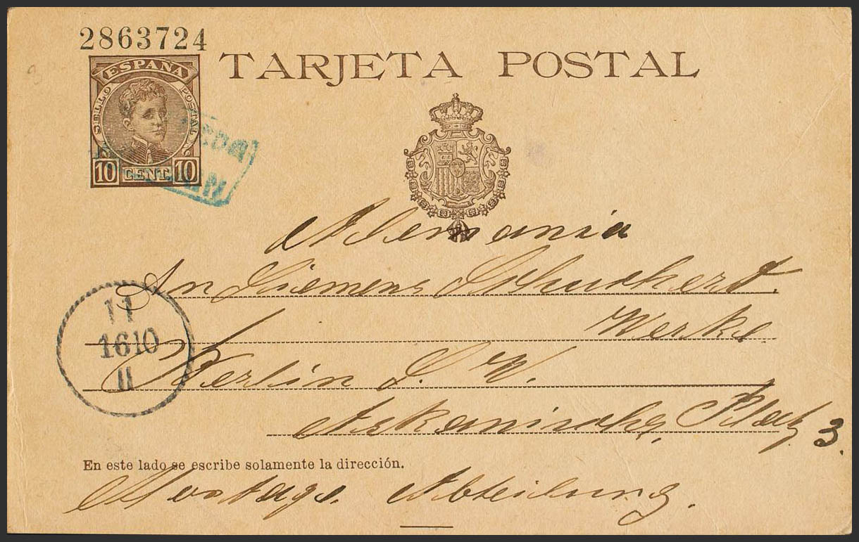 EP37. 1904. 10 cts chestnut on Entire Post Card from ANDOAIN (GUIPUZCOA) to BERLIN. Postmark CARTERIA / ANDOAIN, in blue and arrival on the front. MAGNIFICENT AND RARE.