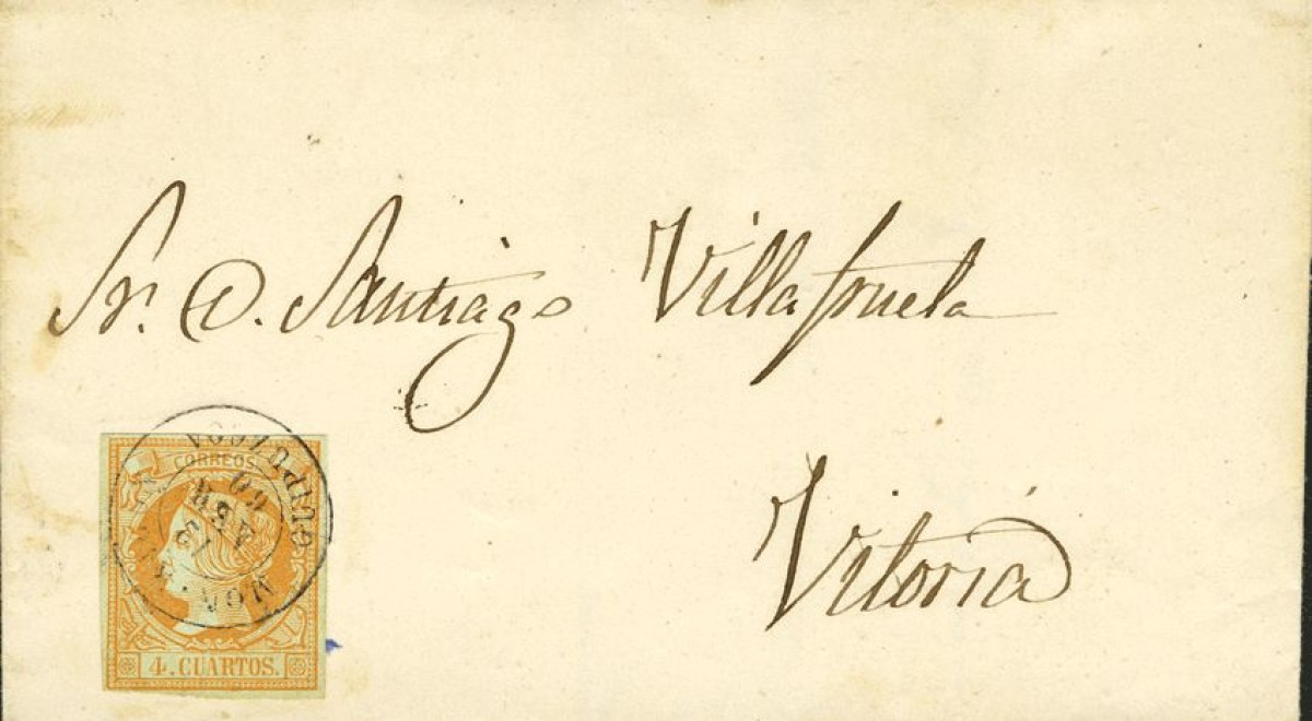 52. 1860. 4 cuartos yellow. MONDRAGON to VITORIA. Postmark MONDRAGON / GUIPUZCOA.