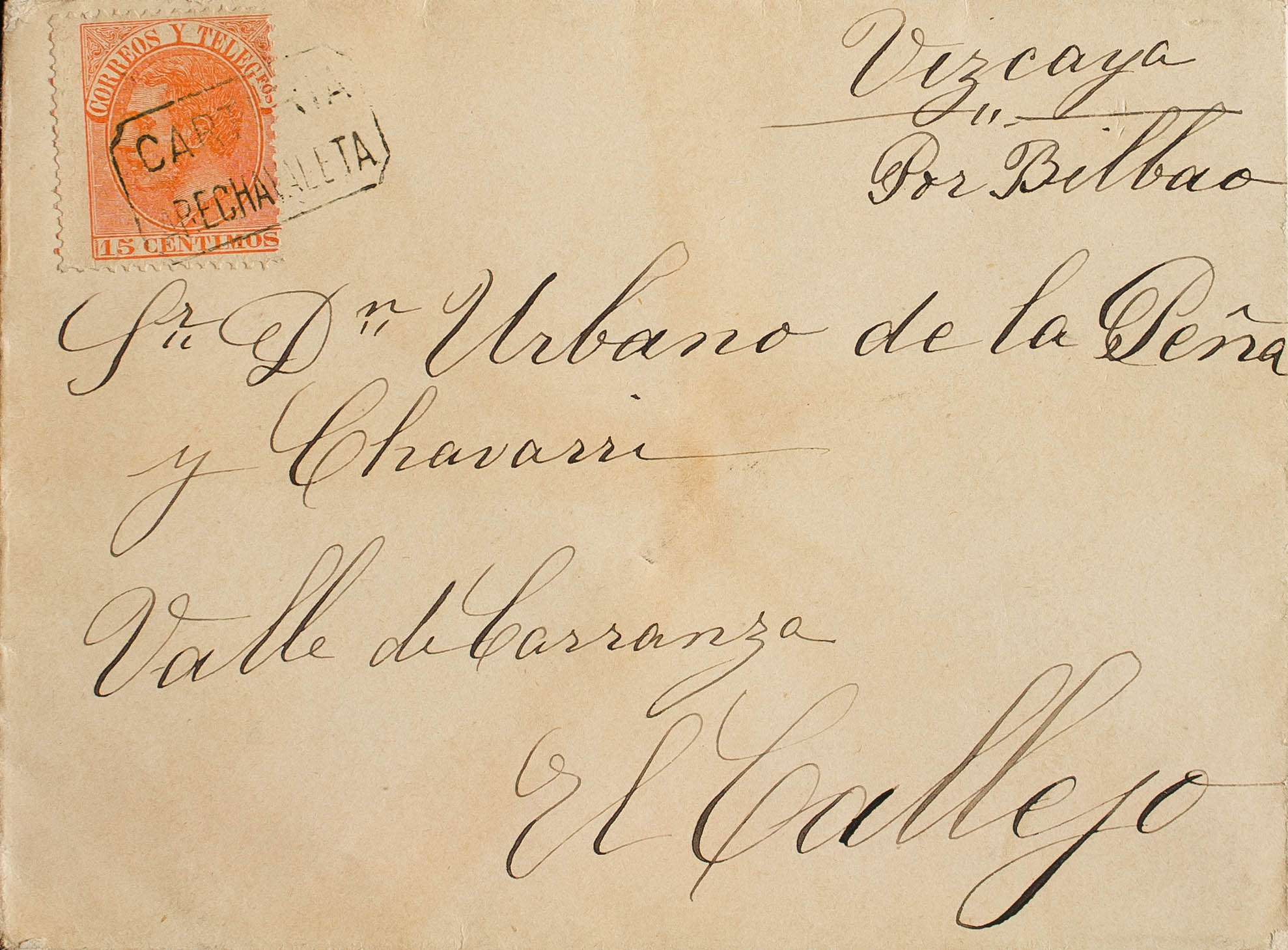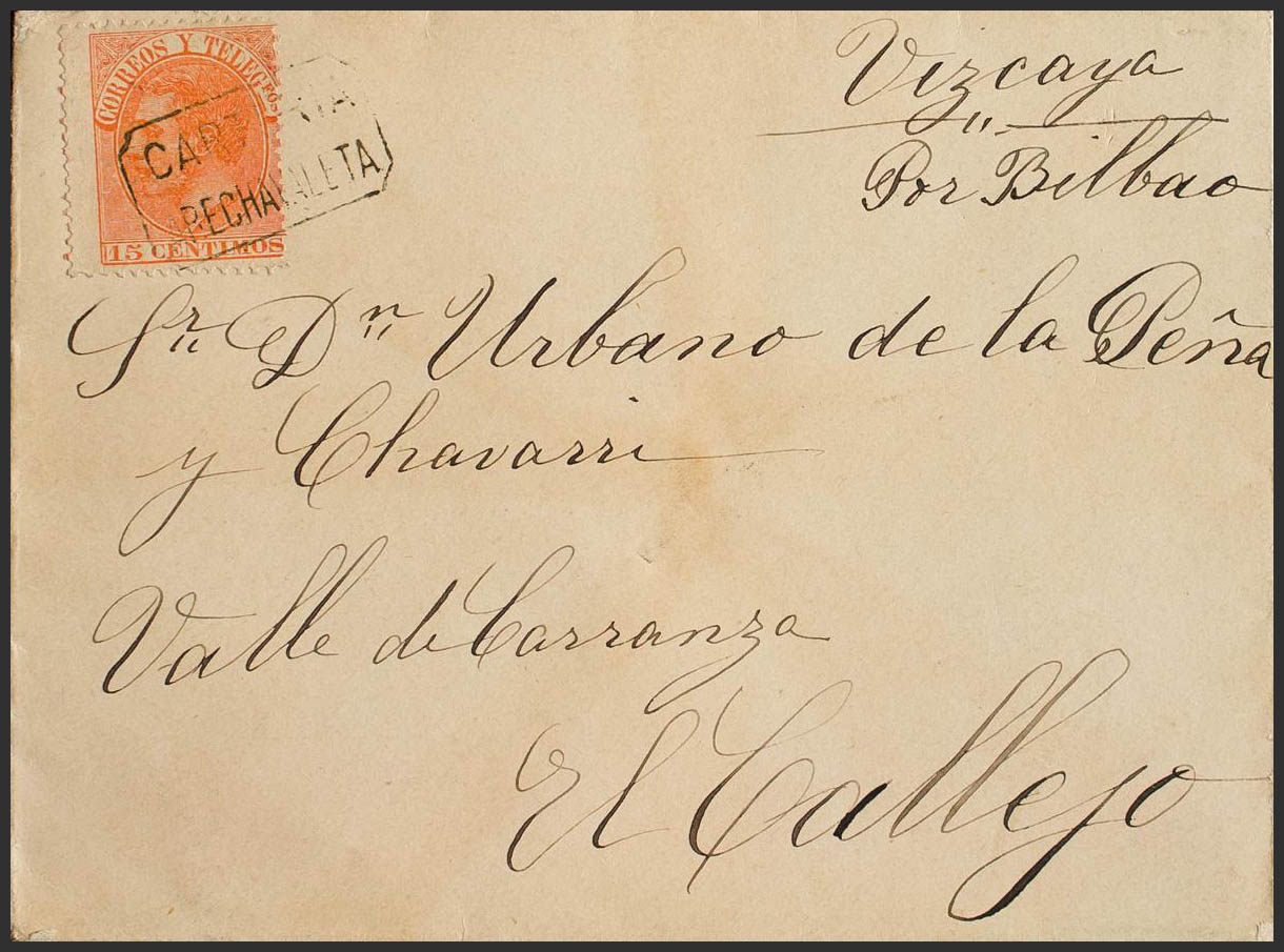210. 1889. 15 orange cts. ARECHAVALETA to EL CALLEJO (BIZCAYA). Postmark CARTERIA / ARECHAVALETA. MAGNIFICENT AND RARE.