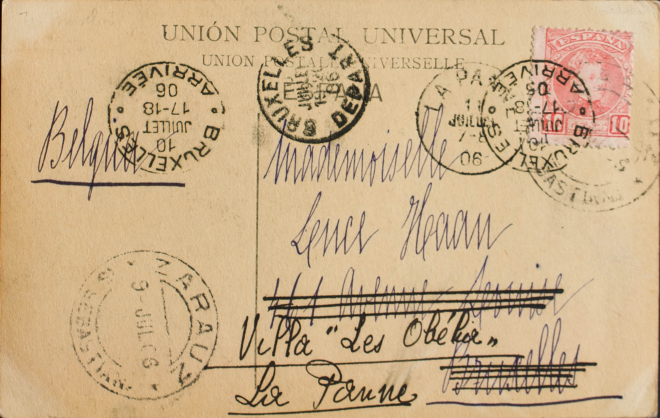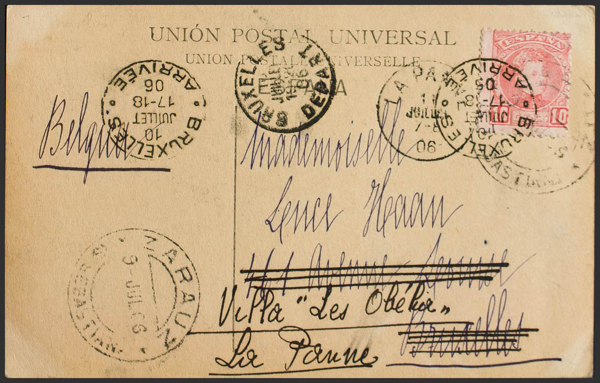 243. 1906. 10 cts red. Postcard from ZARAUZ (GUIPUZCOA) to BRUSSELS (BELGIUM), forwarded to LA PANNE. On the front various traffic marks. MAGNIFICENT.