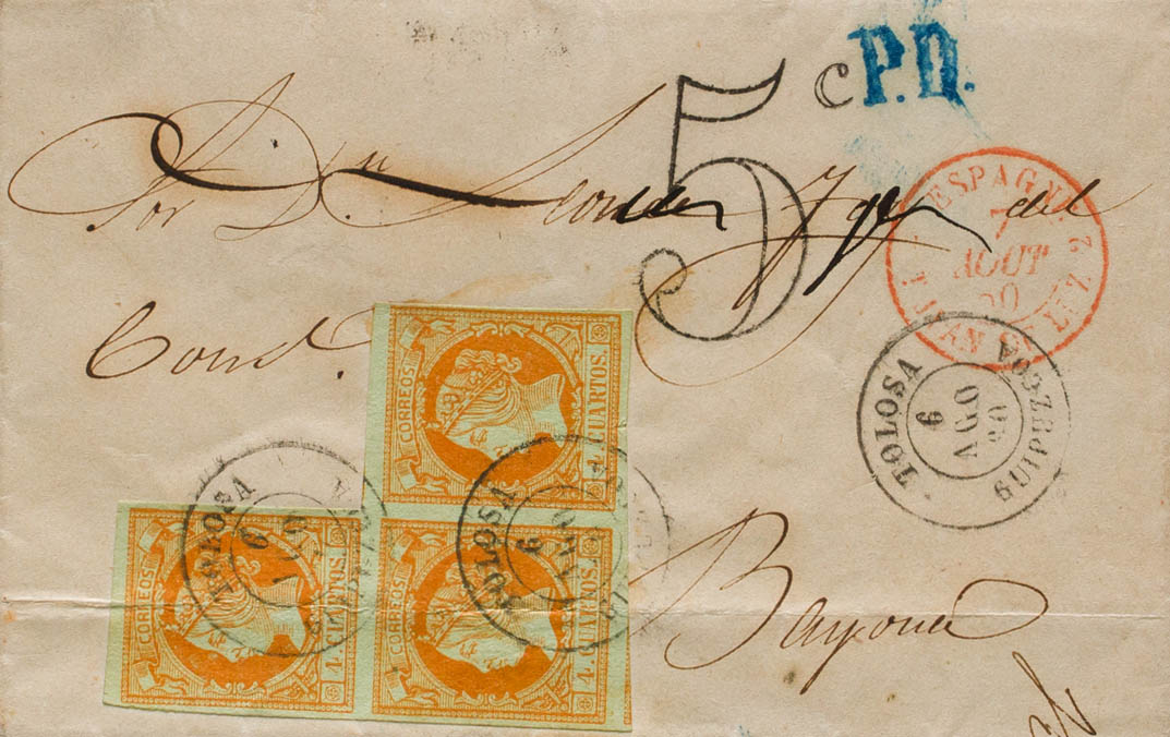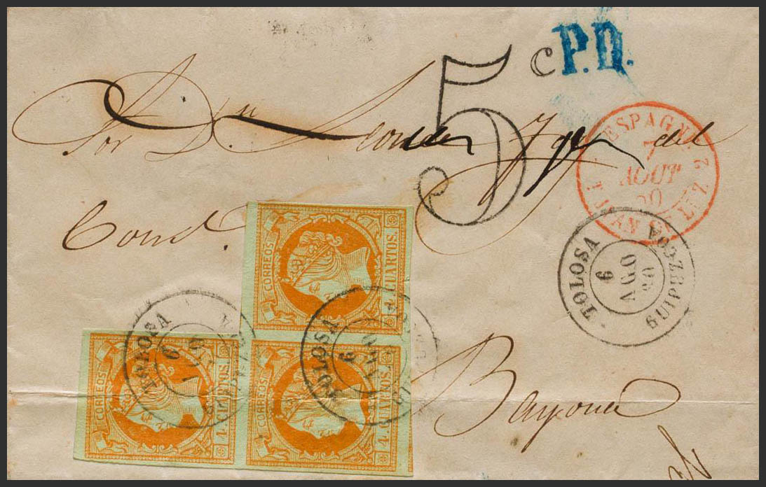 52(3). 1860. 4 orange cuartos , strip of three. TOLOSA to BAYONNE (FRANCE). Postmark TOLOSA / GUIPUZCOA. MAGNIFICENT AND UNUSUAL COMBINATION TO COMPOSE THE RATE OF 12 ROOMS TO FRANCE.