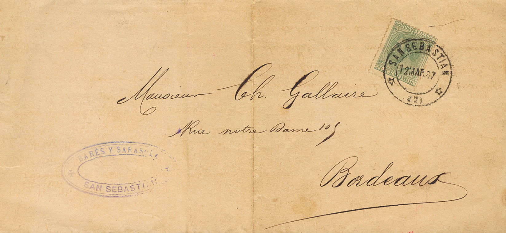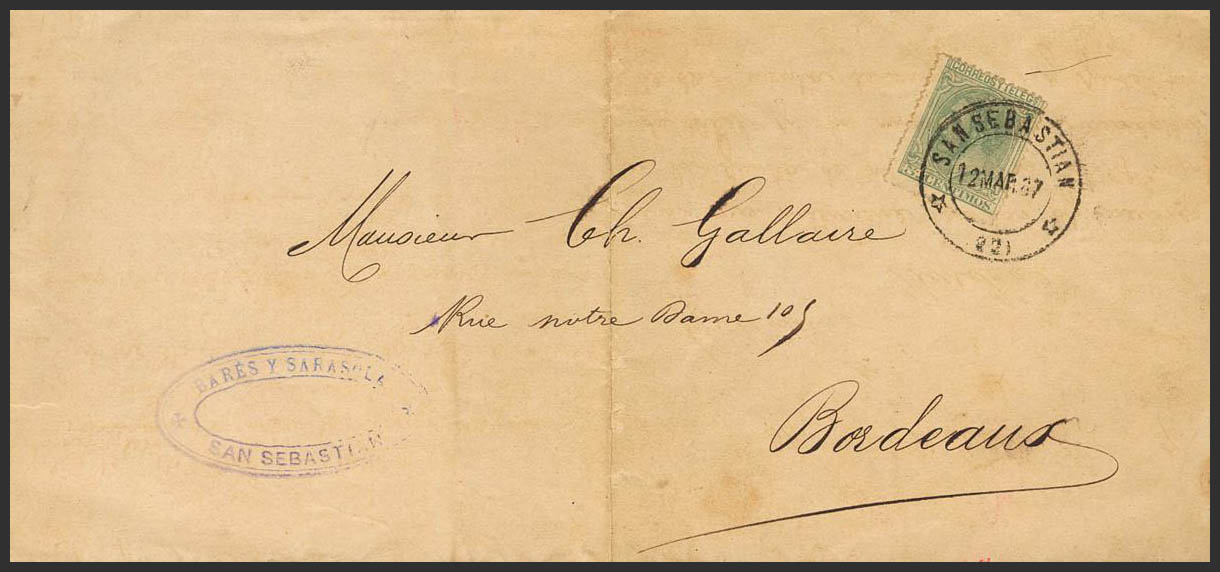 201. 1887. 5 cts green. SAN SEBASTIAN to BORDEAUX (FRANCE). Printing fee. MAGNIFICENT.
