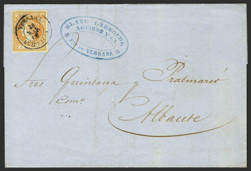 52. 1860. 4 cuartos yellow. VERGARA to ALBACETE. Postmark VERGARA / GUIPUZCOA. MAGNIFICENT.