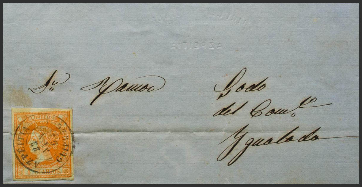 52. 1862. 4 orange cuartos (archival fold). AZPEITIA to IGUALADA. Postmark AZPEITIA / GUIPUZCOA. PRETTY.