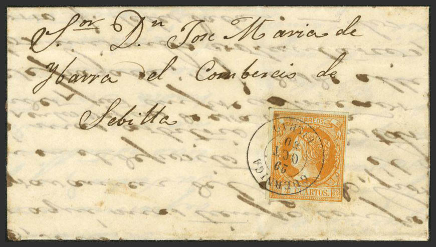 52. 1860. 4 cuartos yellow. GUERNICA to SEVILLE. Postmark GUERNICA / BILBAO. MAGNIFICENT.