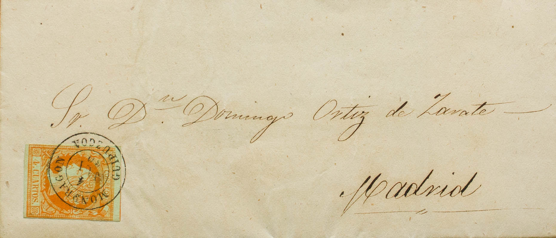 52. 1860. 4 orange cuartos . MONDRAGON to MADRID. Postmark MONDRAGON / GUIPUZCOA. MAGNIFICENT.