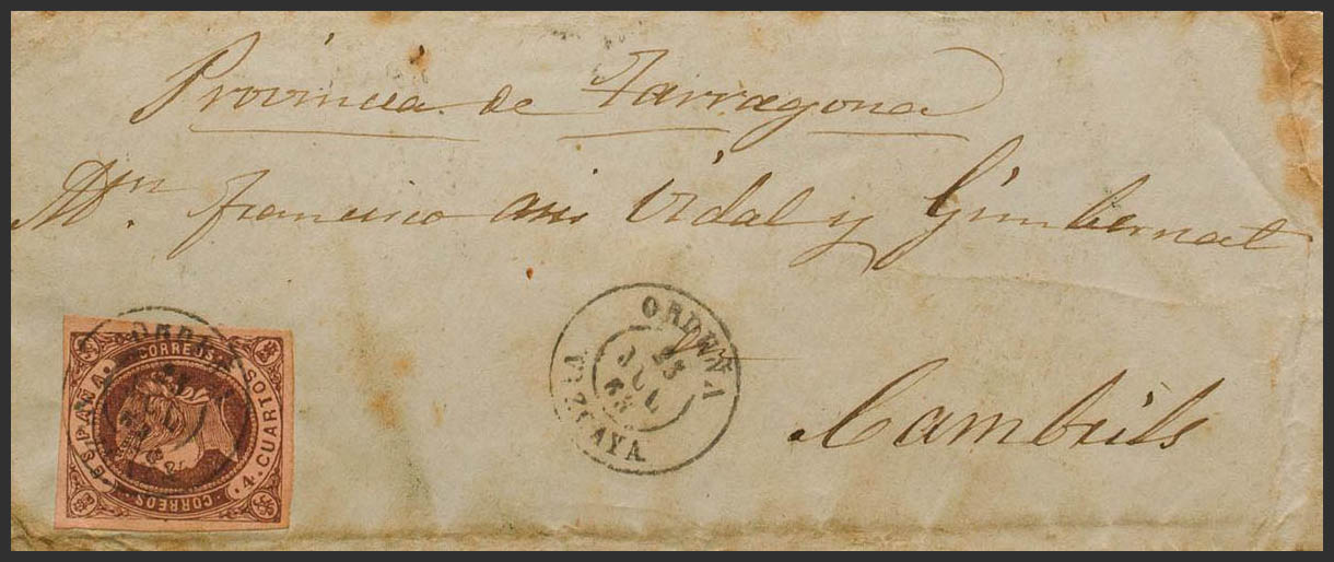 58. 1863. 4- cuartos chestnut. ORDUÑA to CAMBRILS. Postmark ORDUÑA / VIZCAYA. MAGNIFICENT.