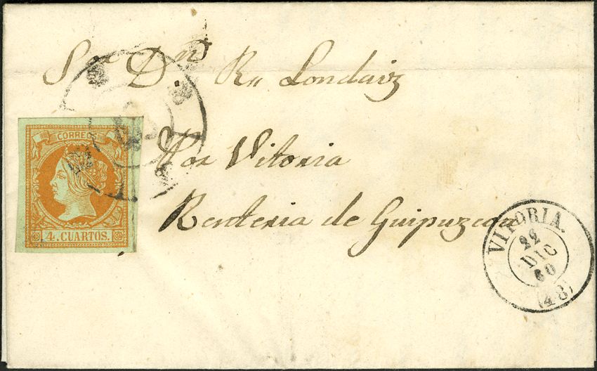52. 1860. 4 cuartos yellow. OCHANDIAN to RENTERIA. Postmark R. CARRETA Nº 48