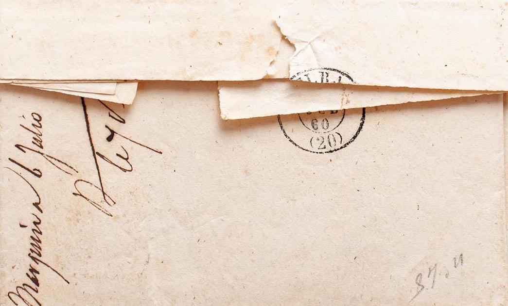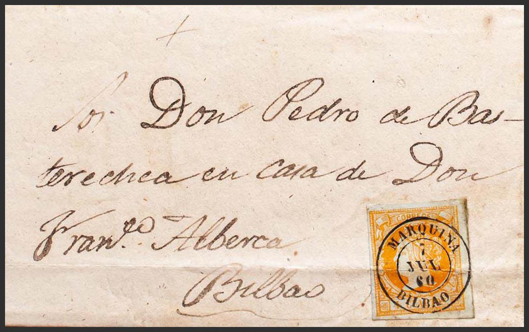 52. 1860. 4 orange cuartos . MARQUINA to BILBAO. MARQUINA / BILBAO postmark, archival fold. MAGNIFICENT.