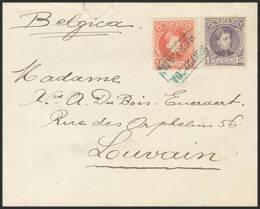 243, 245. 1903. 10 cts red and 15 cts chestnut lilac. HERNANI to LOUVEN (BELGIUM). GUIPUZCOA / HERNANI letter postmark, in blue. MAGNIFICENT.