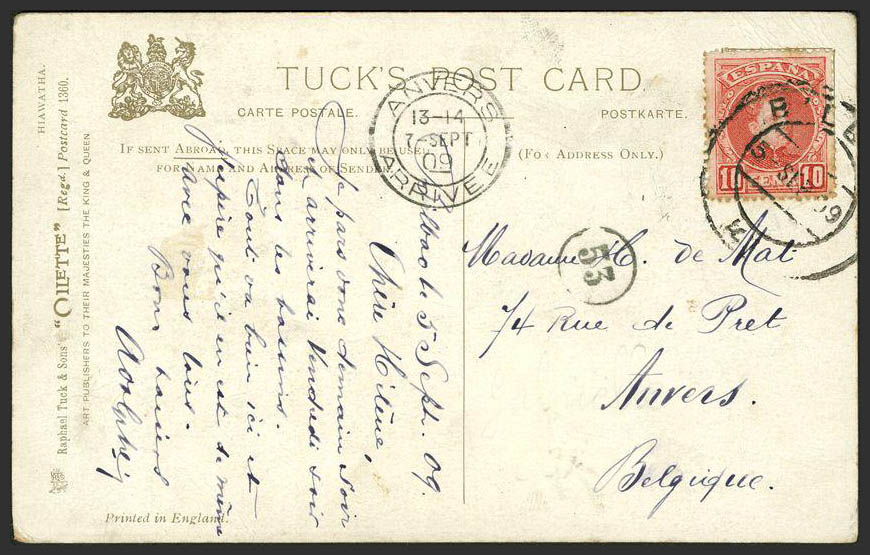 243. 1909. 10 cts. red. Postcard from BILBAO to ANVERS (BELGIUM). Postmark BILBAO / 4. PRETTY.