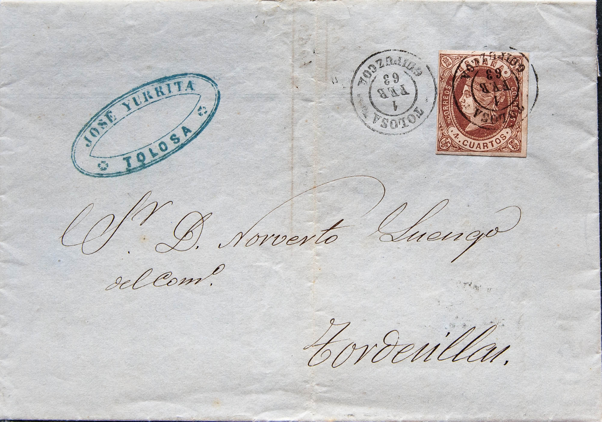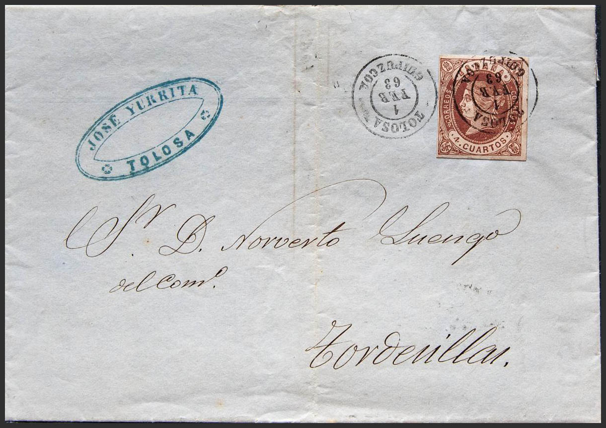 58. 1863. 4 cuartos chestnut. TOLOSA to TORDESILLAS. TOLOSA / GUIPUZCOA postmark. MAGNIFICENT PRINT.