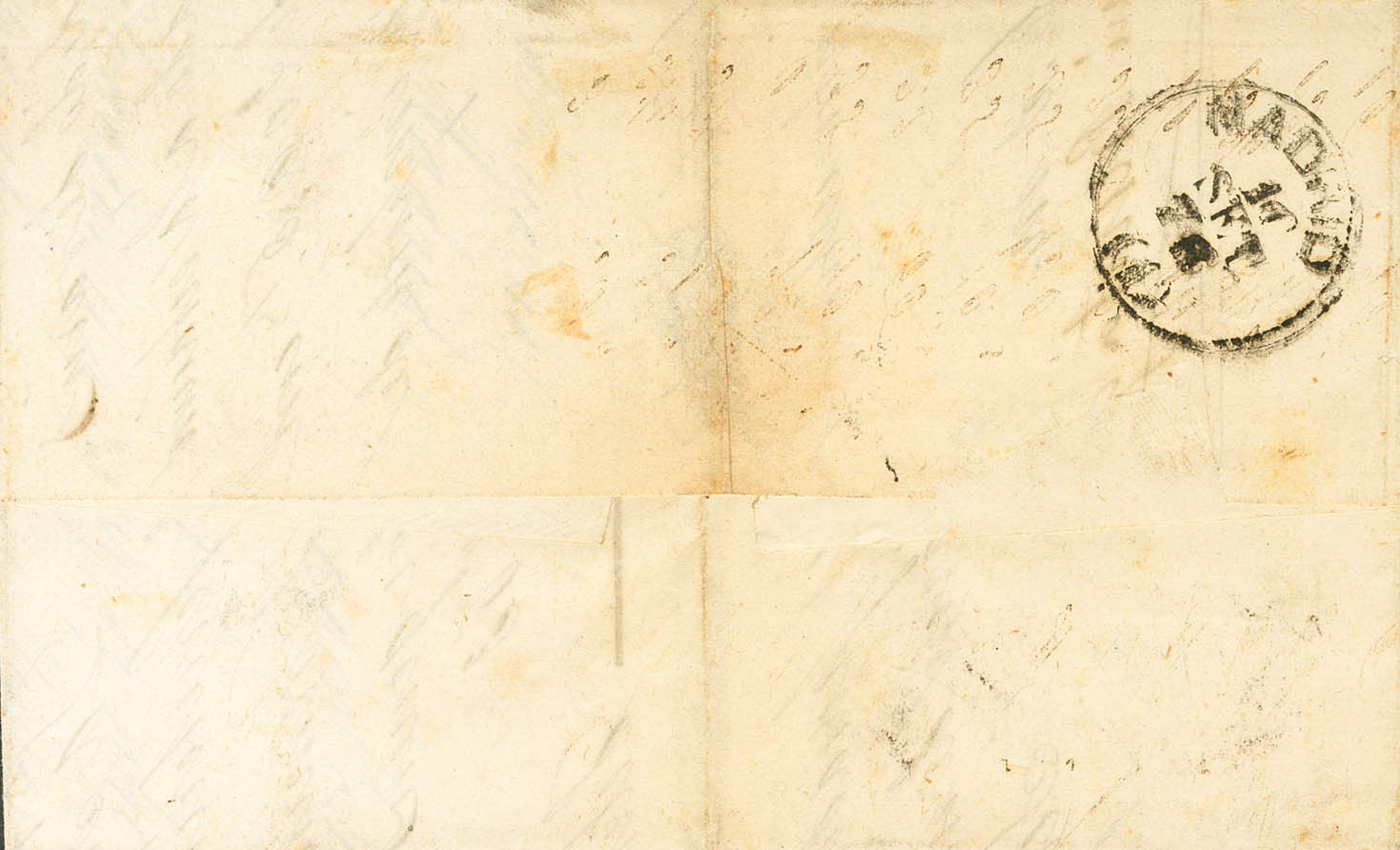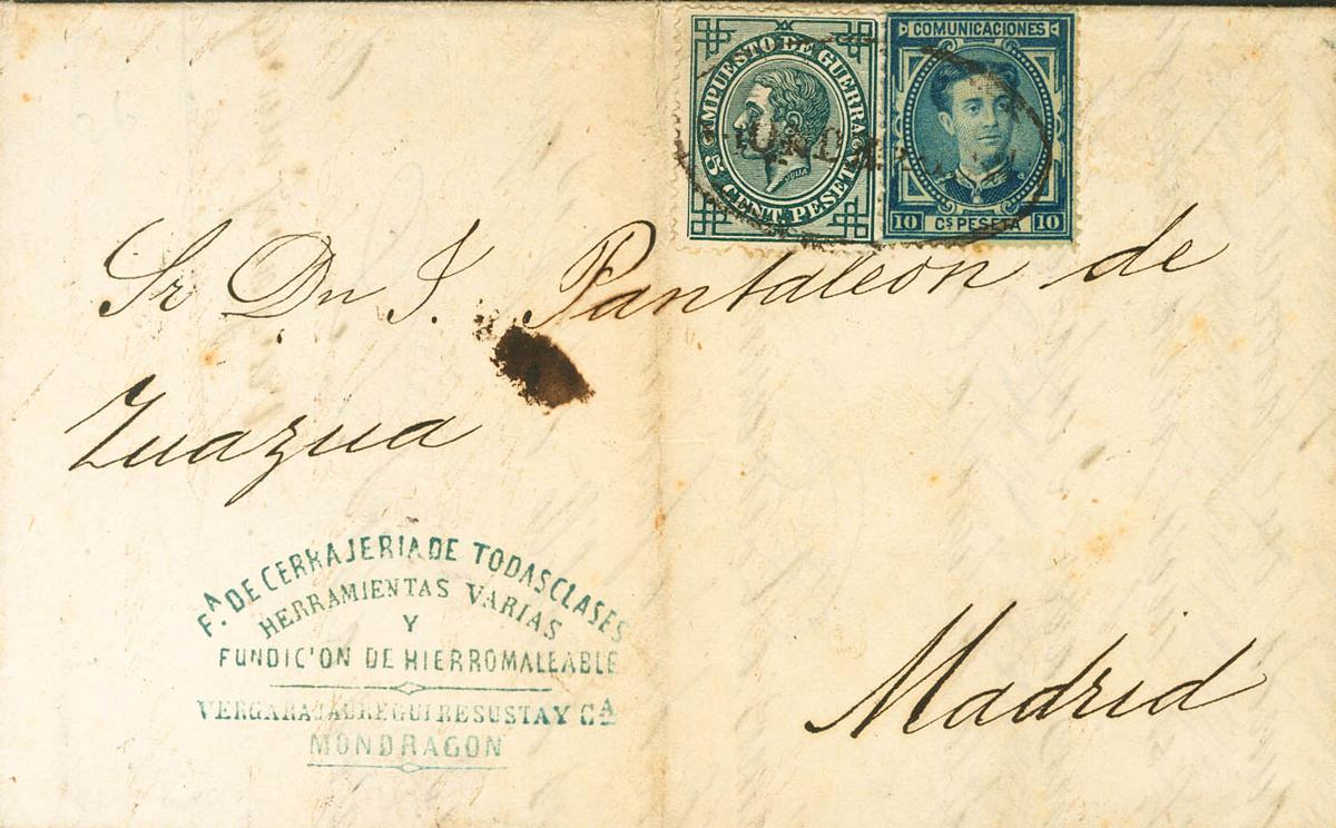 |ENVELOPE| 175, 183. 1876. 10 cts blue and 5 cts green War Tax. MONDRAGON to MADRID. Oval MONDRAGON postmark, in black. MAGNIFICENT AND VERY RARE.