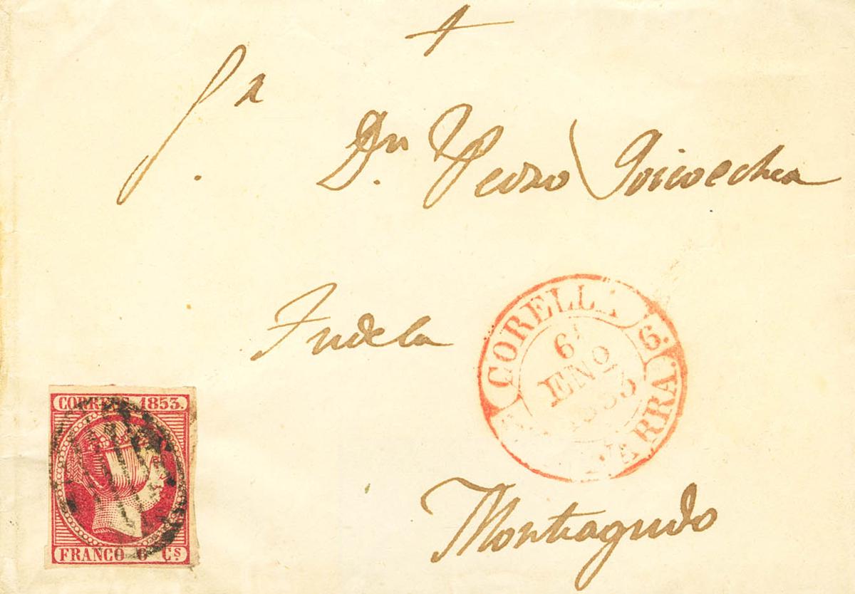 |ABOUT| 17. 1853. 6 carmine quarters. CORELLA to MONTEAGUDO. On the Baeza front CORELLA / NAVARRA, in red. MAGNIFICENT.