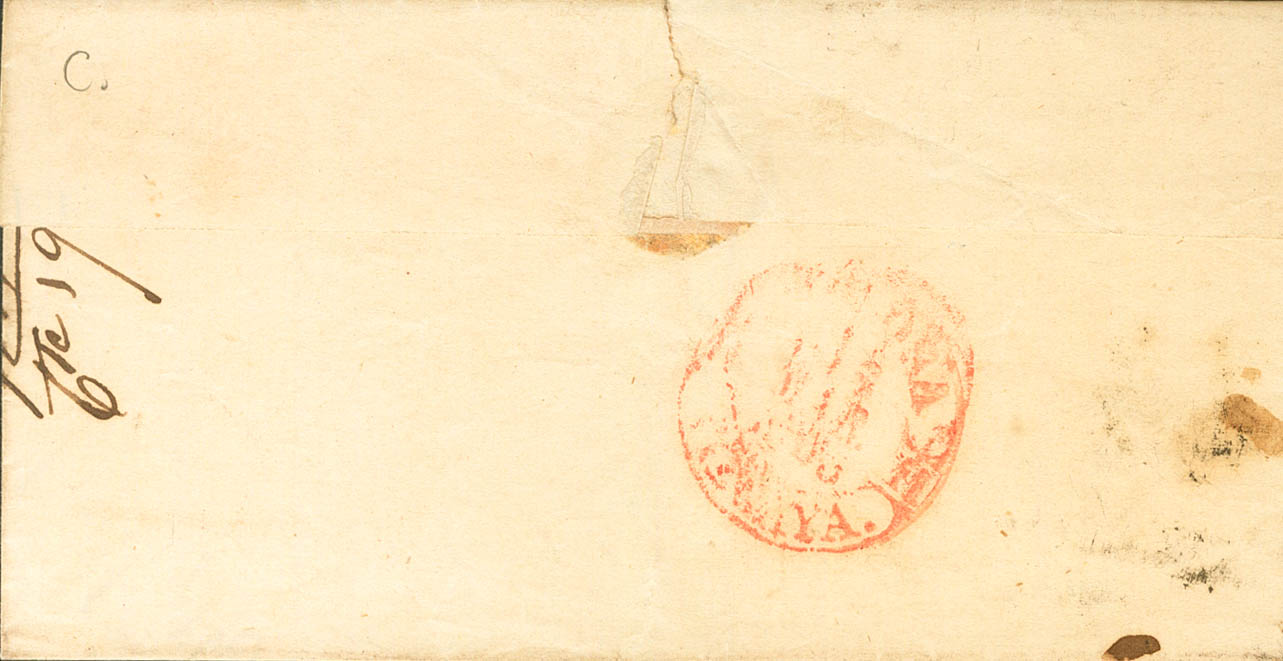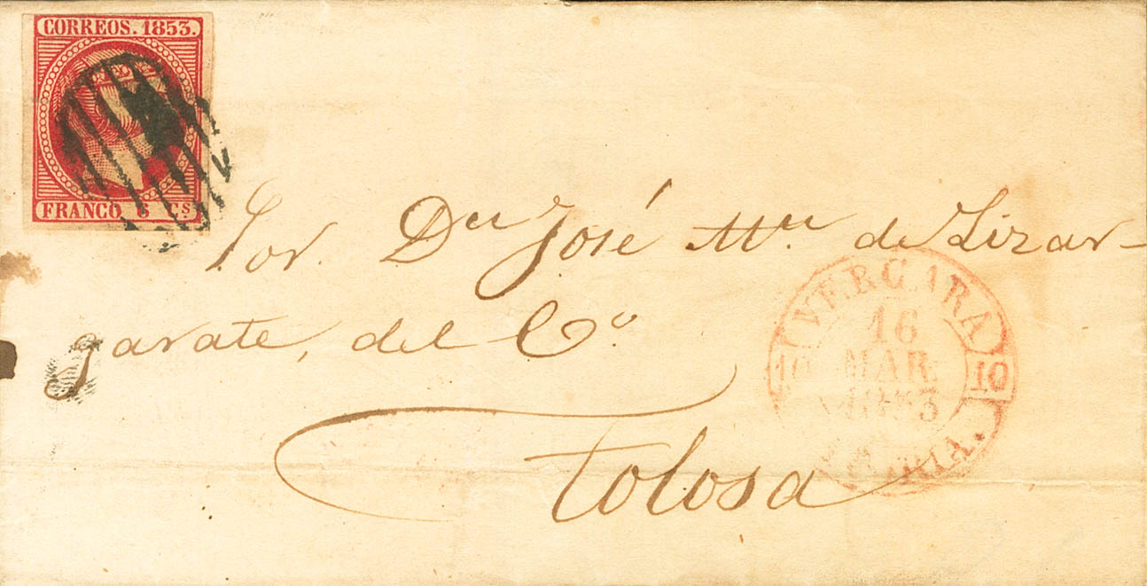 |ABOUT| 17. 1853. 6 carmine quarters. VERGARA to TOLOSA. On the front Baeza VERGARA / VITORIA, in red. MAGNIFICENT.