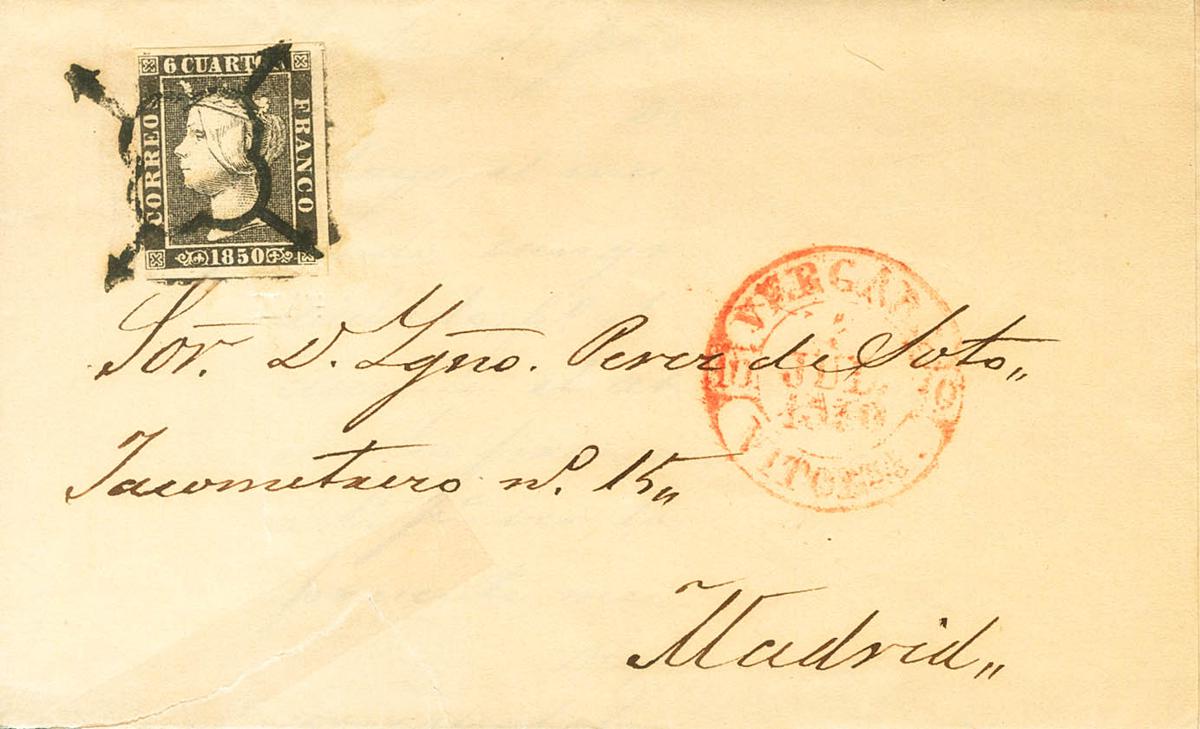 |ENVELOPE| 1A. 1850. 6 black quarters. VERGARA to MADRID. On the front Baeza VERGARA / VITORIA, in red. MAGNIFICENT.