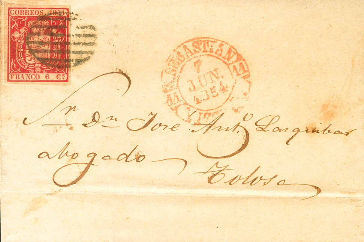 |ABOUT| 24. 1854. 6 carmine quarters. SAN SEBASTIAN to TOLOSA. On the front Baeza S.SEBASTIAN / VIZCAYA, in red. MAGNIFICENT.