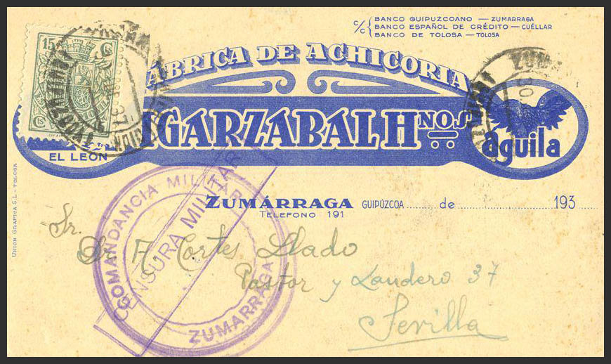 Fis 89. 1937. 15 cts green MOBILE. Postcard from ZUMARRAGA to SEVILLE. On the back arrival. MAGNIFICENT.