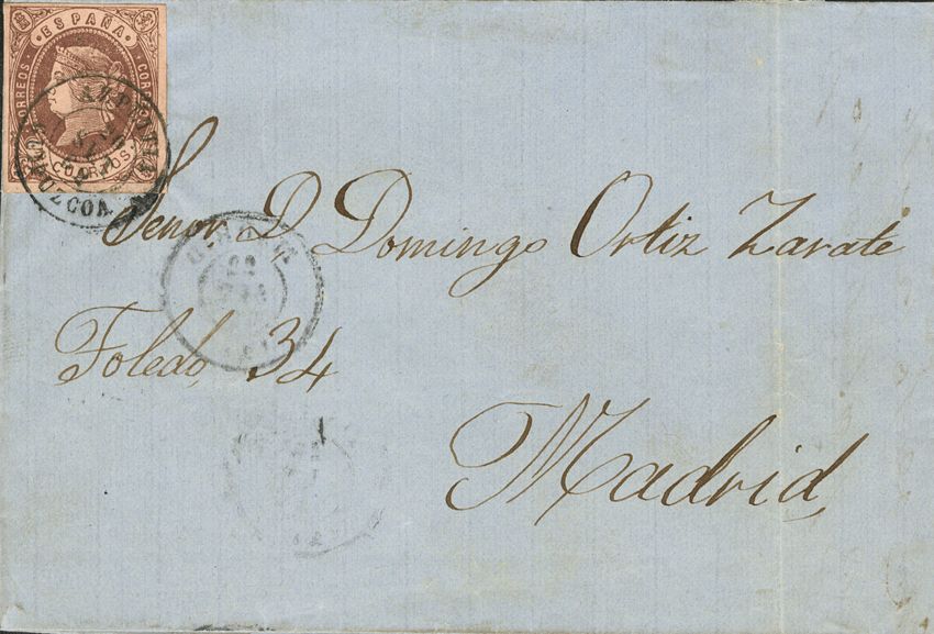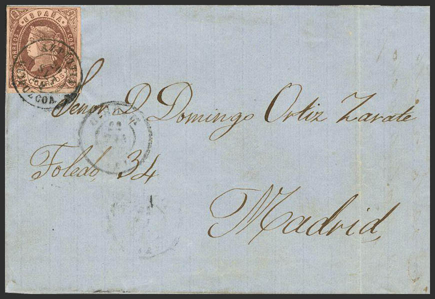 58. 1862. 4- cuartos chestnut. AZPEITIA to MADRID. Postmark AZPEITIA / GUIPUZCOA. MAGNIFICENT.