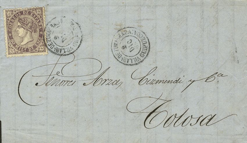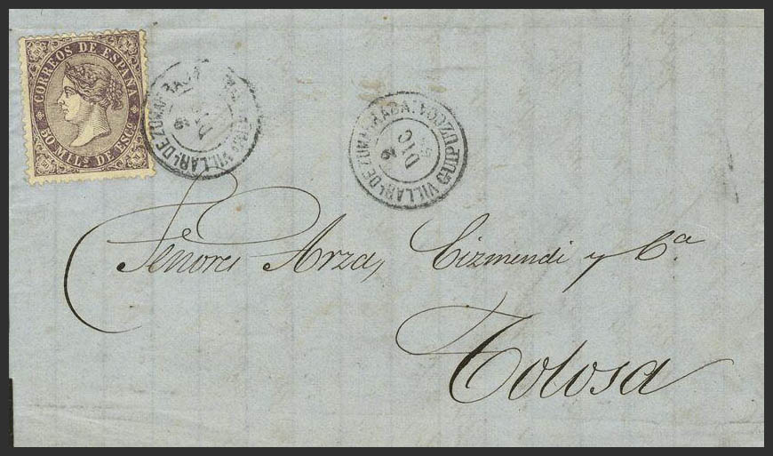 98. 1869. 50 mils violet. VILLARREAL DE ZUMARRAGA to TOLOSA. VILLARL postmark. FROM ZUMARRAGA / GUIPUZCOA. MAGNIFICENT.