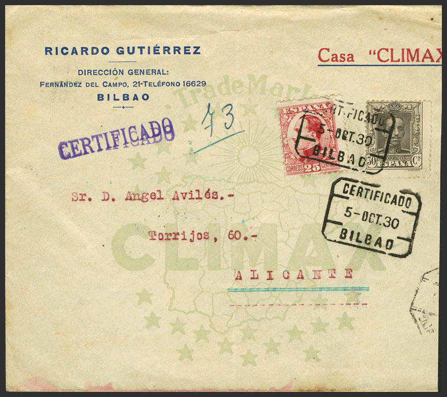 318, 495. 1930. 25 cts and 30 cts. Certificate from BILBAO to ALICANTE. MAGNIFICENT.