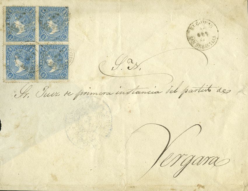 75(4). 1865. 4 cuartos blue, block of four. Judicial Escrow from ELGOIBAR to VERGARA. Postmark ELGOIBAR / SAN SEBASTIAN, quadruple postage. MAGNIFICENT AND RARE.