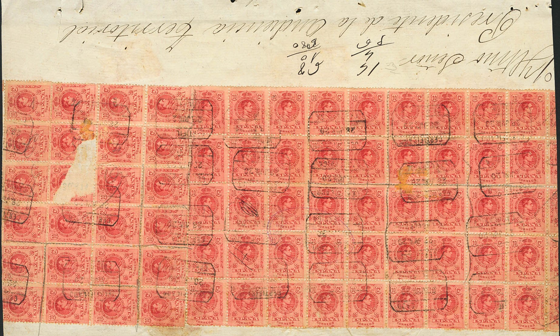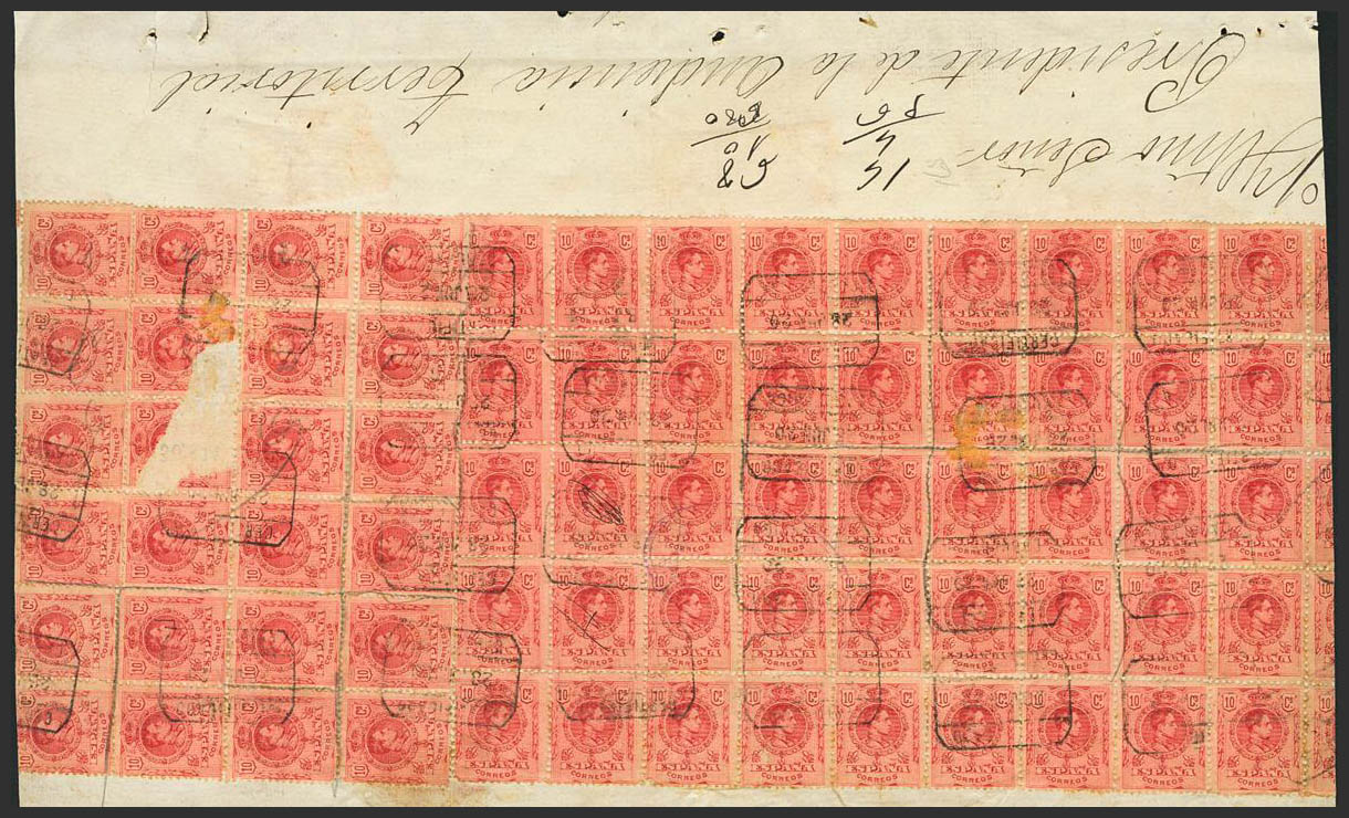 △ 269(69). 1909. 10 cts red, sixty-nine stamps (some with usual defects in blocks of this size), on fragment of Judicial Escrow. CERTIFIED postmark / CABUERNIGA. NICE.
